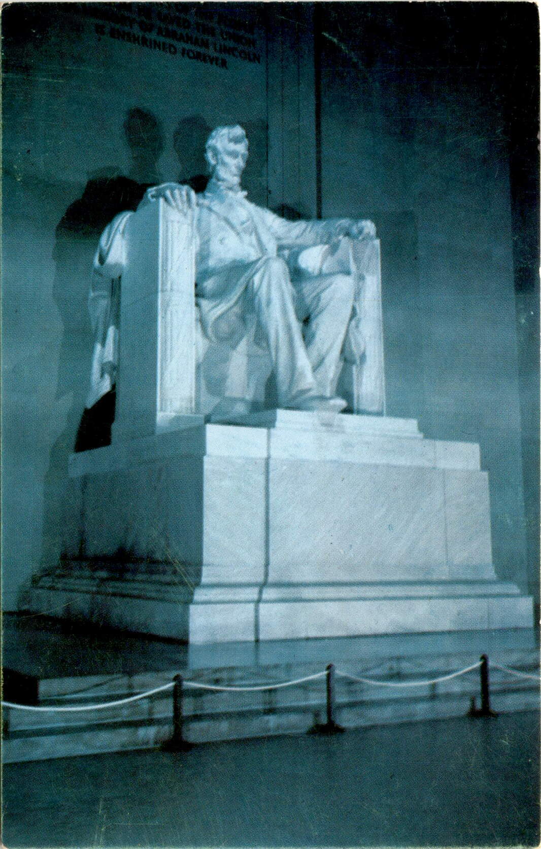 The front of this postcard features a stunning image of the Lincoln Statue, located in the center hall of the Lincoln Memorial. The immense sculptured figure, created by Daniel Chester French, is beautifully captured in this Kodachrome reproduction. The floodlighting of the statue at night creates a dramatic effect, highlighting the rugged features and deep set eyes of Abraham Lincoln.On the back of the postcard, there is space for an address and stamp, allowing the sender to easily mail this picturesque image to a friend or loved one. The postcard provides a brief description of the Lincoln Statue, giving recipients a glimpse into the history and significance of this iconic monument. The L. B. Prince Co. in Arlington, Virginia is credited with producing this high-quality reproduction.The front and back of this postcard work together to showcase the beauty and grandeur of the Lincoln Statue. The detailed image on the front captures the essence of this historic monument, while the back provides practical information for sending and receiving the postcard. Whether kept as a memento or sent as a thoughtful gesture, this postcard serves as a reminder of the enduring legacy of Abraham Lincoln and the importance of preserving our nation’s history.