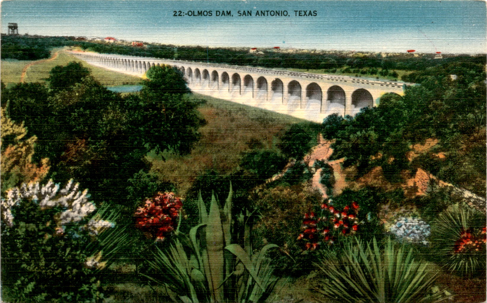 The front of this postcard features a stunning image of Olmos Dam near San Antonio, Texas. The dam, constructed at a cost of $1,571,000, serves as a flood prevention measure at the edge of the city. The dry channel it spans drains rainwater from a wide area of hill country, ultimately flowing into the San Antonio River. Despite its practical purpose, the dam has become a popular spot for leisurely drives, offering scenic views and a peaceful atmosphere.On the back of the postcard, there is space for writing a message to a recipient. The San Antonio Card Co. is credited with publishing this postcard, showcasing the beauty and significance of Olmos Dam. The back also includes a designated area for the address, as well as a reminder to place a stamp in the indicated spot before sending it off. This postcard serves as a tangible reminder of the natural and man-made wonders that can be found in and around San Antonio, Texas.Overall, this postcard provides a glimpse into the history and purpose of Olmos Dam, while also highlighting its aesthetic appeal. Whether sent as a souvenir or kept as a memento, this postcard captures a moment in time at a significant location in San Antonio. It serves as a reminder of the importance of infrastructure like dams for flood prevention, as well as the beauty that can be found in unexpected places.