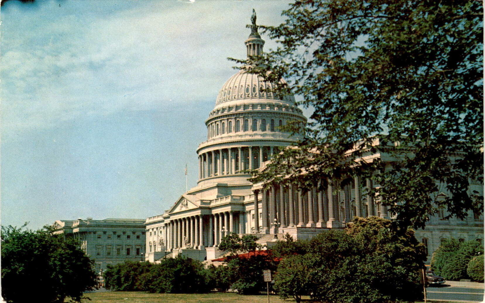 The front of this postcard features a stunning image of the U.S. Capitol in Washington, D.C. The Capitol is described as one of the largest and most majestic buildings in the world, sitting on a height overlooking the Potomac amphitheatre. The Statue of Freedom on the dome of the Capitol is a prominent feature, towering 307 feet above the esplanade. The postcard provides interesting historical information about the construction of the Capitol, including the laying of the cornerstone by President Washington in 1793.Turning to the back of the postcard, we see the classic layout for mailing a postcard. The back includes space for a stamp and an address, as well as a message from the sender. The postcard is from the Capitol Souvenir Company, Inc. in Washington, D.C., indicating that it is a popular souvenir for visitors to the nation’s capital. The postcard is a great way to share the beauty and history of the U.S. Capitol with friends and family.Overall, this postcard is a wonderful keepsake for anyone who has visited or has an interest in the U.S. Capitol. The front provides a stunning visual of the iconic building, while the back offers a glimpse into its history and significance. Whether sent as a memento or kept as a personal reminder of a trip to Washington, D.C., this postcard captures the grandeur and importance of the U.S. Capitol.