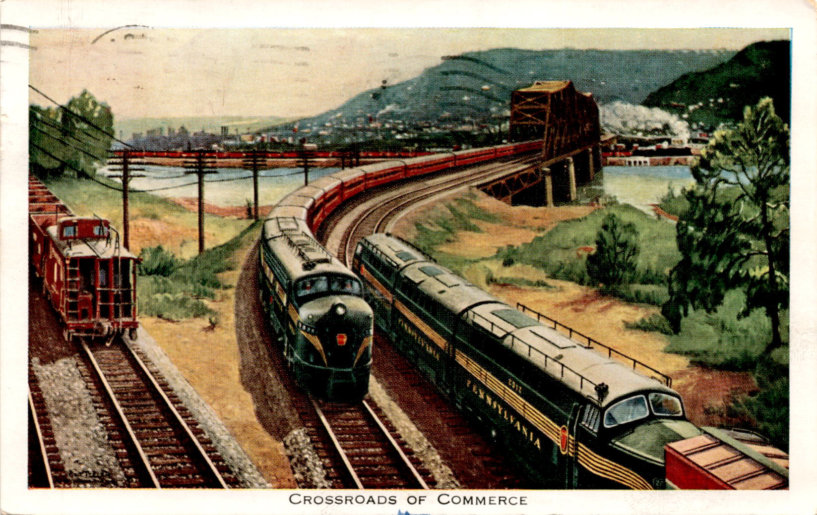 vintage Crossroads of Commerce trains New York St Louis Wheeling West Postcard