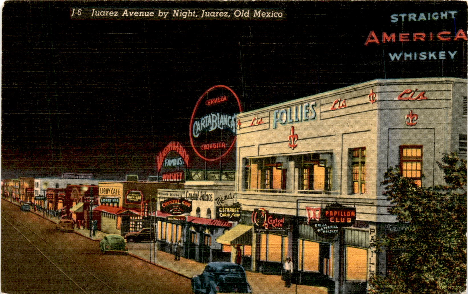 The front of this postcard showcases a vibrant and bustling scene of Juarez Avenue by night in Old Mexico. The colorful lights and lively atmosphere capture the essence of this historic city. The postcard features various advertisements for American whiskey and Cerveza Cartablanca, adding to the nostalgic charm of the image.On the back of the postcard, there are various details and messages printed, including the address of Whiskey Sandoval News Service in El Paso, Texas. The postcard also features the logo of Genuine Curteich-Chicago C.T. Art-Colortone and instructions for placing a stamp. The back of the postcard provides a glimpse into the past, with its vintage design and typography.Overall, this postcard is a unique and charming piece of history that captures the essence of Old Mexico. From the bustling streets of Juarez Avenue to the advertisements for American whiskey, this postcard is a snapshot of a bygone era. Whether used for sending a message or kept as a collectible, this postcard is sure to evoke a sense of nostalgia and wonder.
