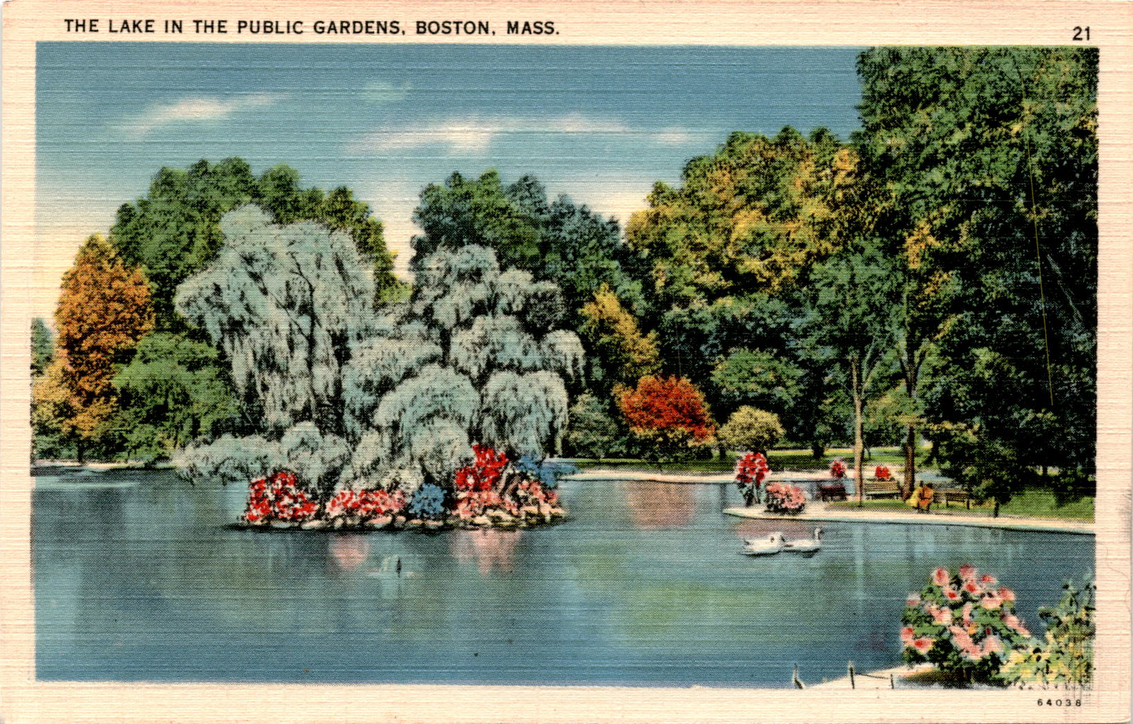 The front of this postcard features a picturesque scene of the lake in the Public Gardens in Boston, Massachusetts. The image shows the artificial pond where swan boats gracefully glide over the water. The Public Gardens, covering about twenty-five acres, is described as the gem of city parks and is located adjacent to the historic Boston Common. The postcard is labeled as a Tichnor Quality View and was made by Tichnor Brothers, Inc. in Boston.Turning the postcard over, we see the back side which includes the address and information about the manufacturer. The postcard was made in the USA and specifically in Boston, Massachusetts by Tichnor Brothers, Inc. The back also includes a space for a one cent stamp to be placed for mailing. The back of the postcard is simple and straightforward, providing the necessary details for sending the postcard to a recipient.Overall, this postcard captures the beauty of the Public Gardens in Boston and serves as a lovely memento of a visit to the city. The front showcases the serene lake and swan boats, while the back provides the practical information needed for mailing. The Tichnor Brothers, Inc. are known for their high-quality views, and this postcard is a perfect example of their craftsmanship. Whether kept as a keepsake or sent to a friend, this postcard is a charming representation of the beauty found in the Public Gardens of Boston.