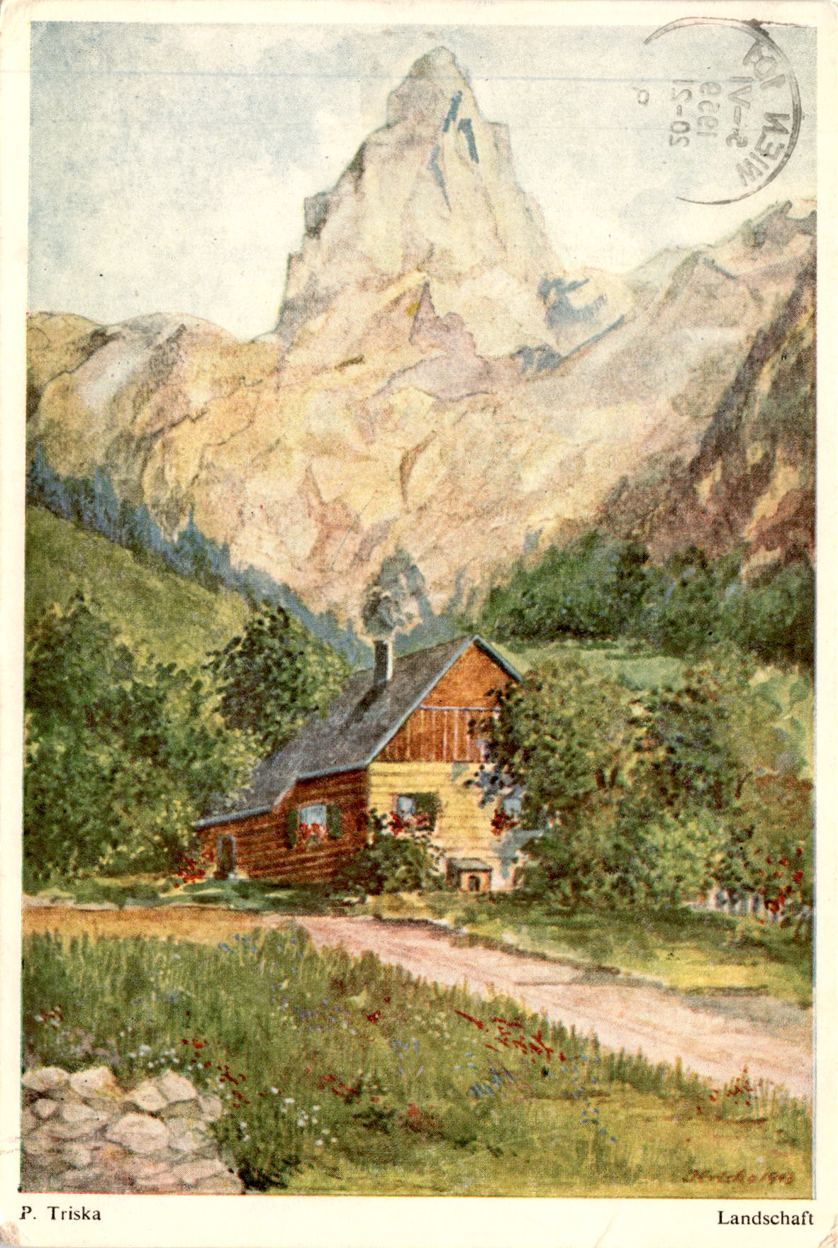 The front of the postcard features a picturesque landscape with rolling hills and a quaint village in the distance. The back of the postcard is filled with handwritten notes in German, detailing the sender’s travels and plans to meet up with a friend named Natalie. The postcard is addressed to a recipient in Vienna, Austria, adding to the charm of the communication.The sender, P. Triska, seems to be on a journey through Austria, as they mention visiting various locations such as Merenc and Landschaft. They express excitement about meeting up with Natalie and Dr. Erika Rev-Szapor, indicating a social aspect to their travels. The mention of a weekend in August suggests that the sender is planning to extend their trip and continue exploring the region.Overall, the postcard provides a glimpse into the sender’s travels and interactions with friends along the way. The handwritten notes add a personal touch to the communication, giving the recipient a sense of connection to the sender’s experiences. The postcard serves as a memento of the sender’s adventures in Austria and their plans for future meetups, making it a special keepsake for both the sender and the recipient.