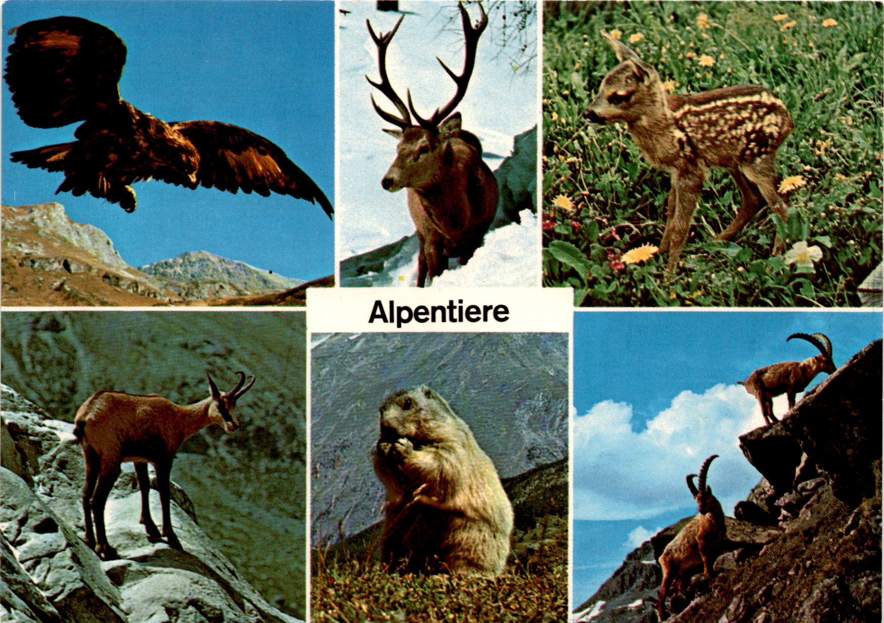 Back of PostcardThe front of this postcard features a colorful photograph of various alpine animals, including an eagle, deer, chamois, fawn, marmot, and ibex. These animals are commonly found in the Alps and are known for their adaptability to the harsh mountain environment. The vibrant colors and detailed images make this postcard a beautiful souvenir for nature lovers and wildlife enthusiasts.