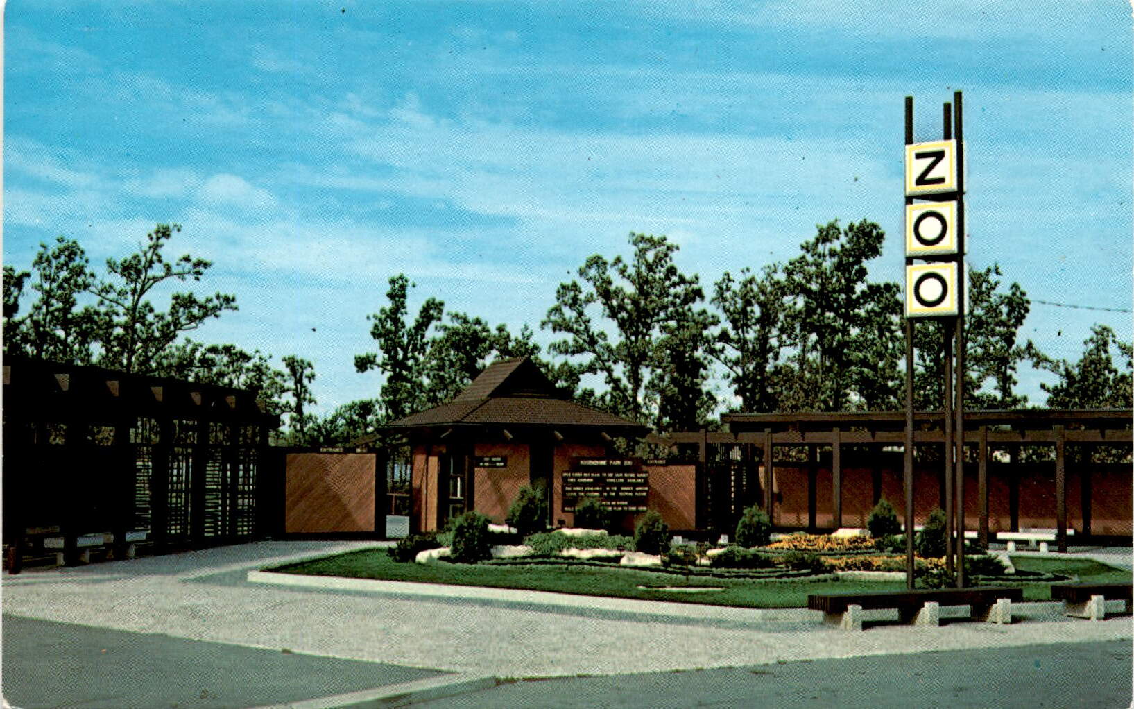 The front of this postcard features a vibrant image of Assiniboine Park in Winnipeg, Manitoba, Canada. The park is a popular destination for both locals and tourists, known for its beautiful gardens, walking trails, and the Assiniboine Park Zoo. The sign in the image reads “NOO ENTRANCE TO THE ZOO,” which may be a playful nod to the fact that the entrance to the zoo is actually located elsewhere in the park.