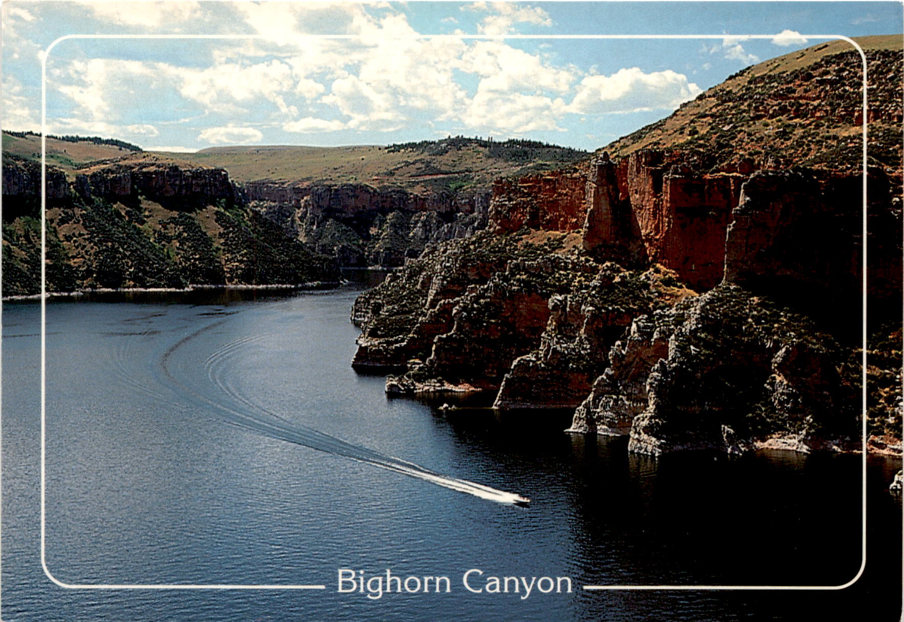 Bighorn Canyon, as depicted on this postcard, is a stunning natural wonder located in Montana. The canyon offers a variety of activities for outdoor enthusiasts, including boating and fishing. The crystal-clear waters of the canyon provide the perfect setting for a relaxing day on the water, whether you’re cruising in a boat or casting a line in search of the perfect catch. The photo on the postcard, taken by Rick Jackson, captures the beauty of the canyon and showcases the peaceful serenity of the area.Surrounding the canyon are the picturesque landscapes of Montana, with rolling hills and rugged terrain creating a breathtaking backdrop for visitors to enjoy. The area is home to a diverse array of wildlife, including bighorn sheep, which can often be spotted grazing along the canyon walls. The tranquility of the canyon makes it a popular destination for nature lovers and outdoor adventurers looking to escape the hustle and bustle of city life.Bighorn Canyon is a hidden gem in Montana, offering a peaceful retreat for those looking to connect with nature. Whether you’re exploring the canyon by boat, fishing in its pristine waters, or simply taking in the stunning views, Bighorn Canyon is sure to leave a lasting impression on all who visit. The postcard serves as a reminder of the beauty and tranquility of this natural wonder, inviting others to come and experience the magic of Bighorn Canyon for themselves.