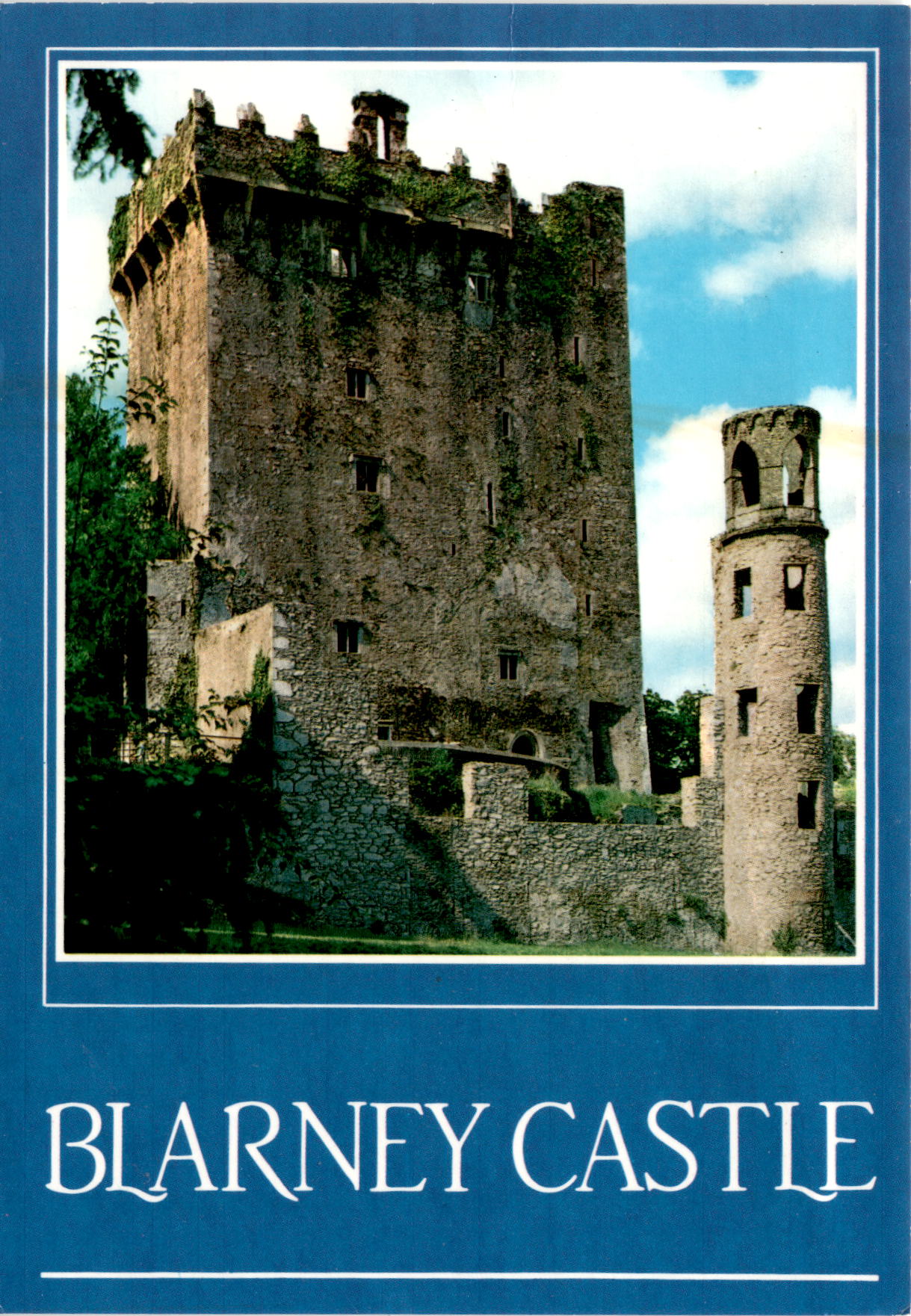 The front of the postcard features a picturesque image of Blarney Castle, located just five miles from Cork City in Ireland. The castle is famous for the Blarney Stone, which is said to give the gift of eloquence to those who kiss it. The word “Blarney” itself means pleasant talk that is meant to deceive without causing offense. The castle’s battlements are a classic example of Irish architecture, with the Stone set into the wall below them.