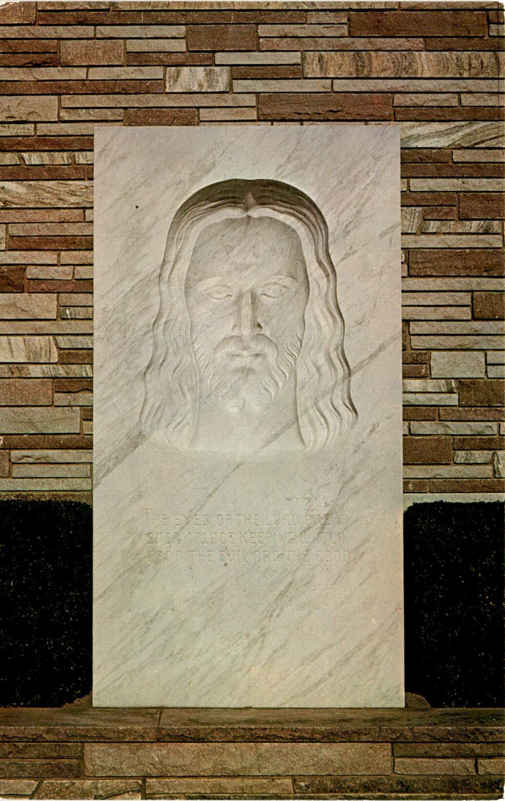 The front of the postcard features a color photo of the Christus Gardens in Gatlinburg, Tennessee. The Gardens are described as a major visitor attraction of the Smokies, with a beautiful Patio Garden that houses a unique and mystifying feature – a heroic face of Our Lord sculptured in a six-ton block of Carrara marble. This sculpture is designed in such a way that the entire face appears to turn in any direction taken by the spectator moving in front of it.