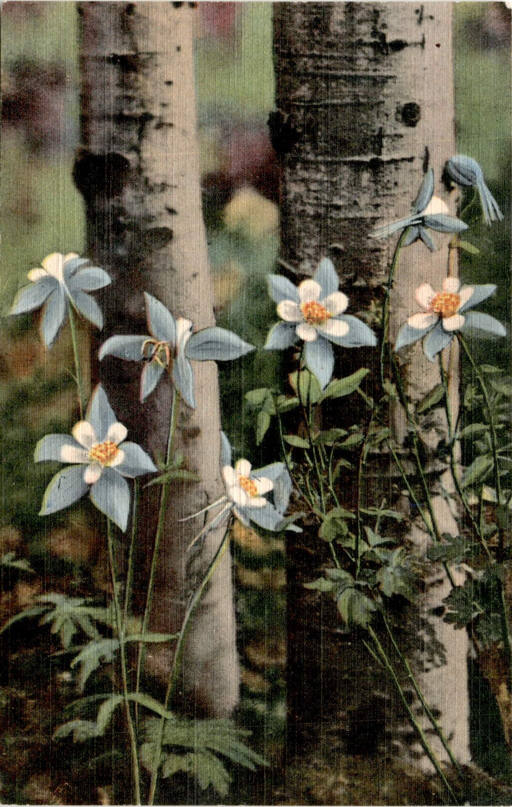 The front of the postcard features a beautiful image of Colorado Columbines growing along the aspens. The Columbine, which is the state flower of Colorado, was actually selected by a vote of the school children. It is known as one of the most distinctive wild flowers in the state, with its dainty and exquisite appearance. The flower typically grows in timbered vales in the mountains, adding to the natural beauty of Colorado.
