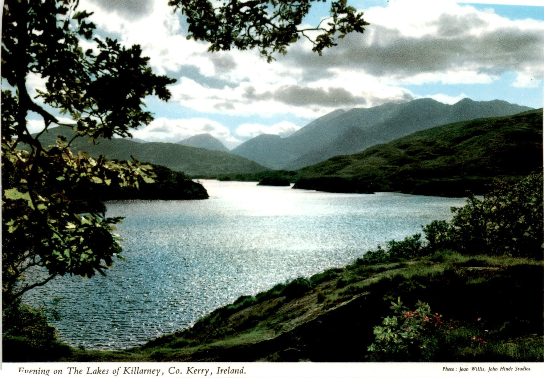 The front of the postcard features a stunning evening view of the Lakes of Killarney in County Kerry, Ireland. The photo was taken by Joan Willis of the renowned John Hinde Studios. The Lakes of Killarney are known for their beauty and are surrounded by lush forests and mountains, making it a popular tourist destination in Ireland.