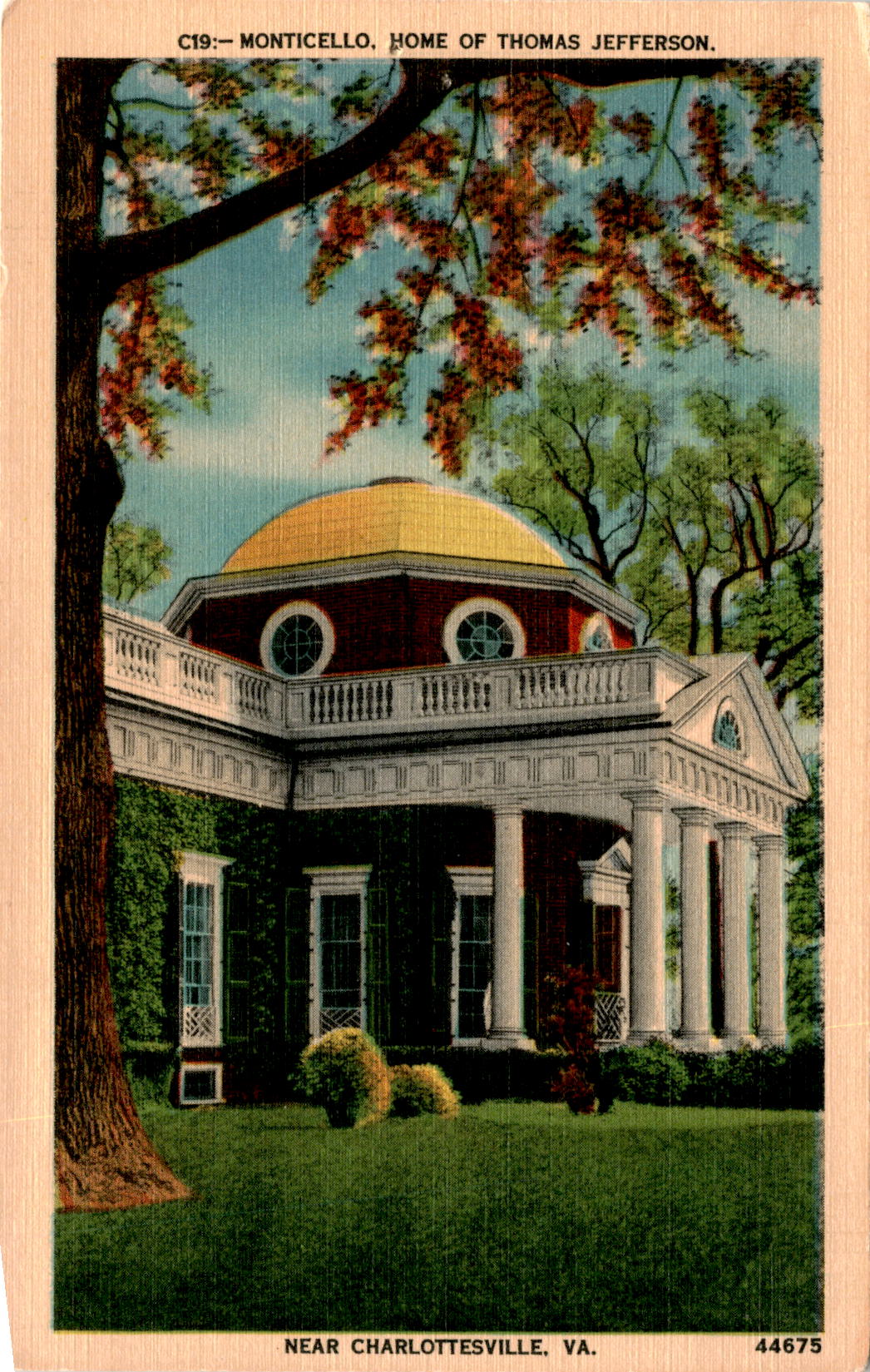 The front of the postcard features a stunning image of Monticello, the home of Thomas Jefferson, located near Charlottesville, Virginia. Designed and built by Jefferson himself, Monticello is considered one of the most perfect examples of architecture in America. Construction of the home began in 1769 and took several years to complete, with most of the materials being made on the property. Jefferson’s inventive mind is evident throughout the home, with many devices he created still in use today.