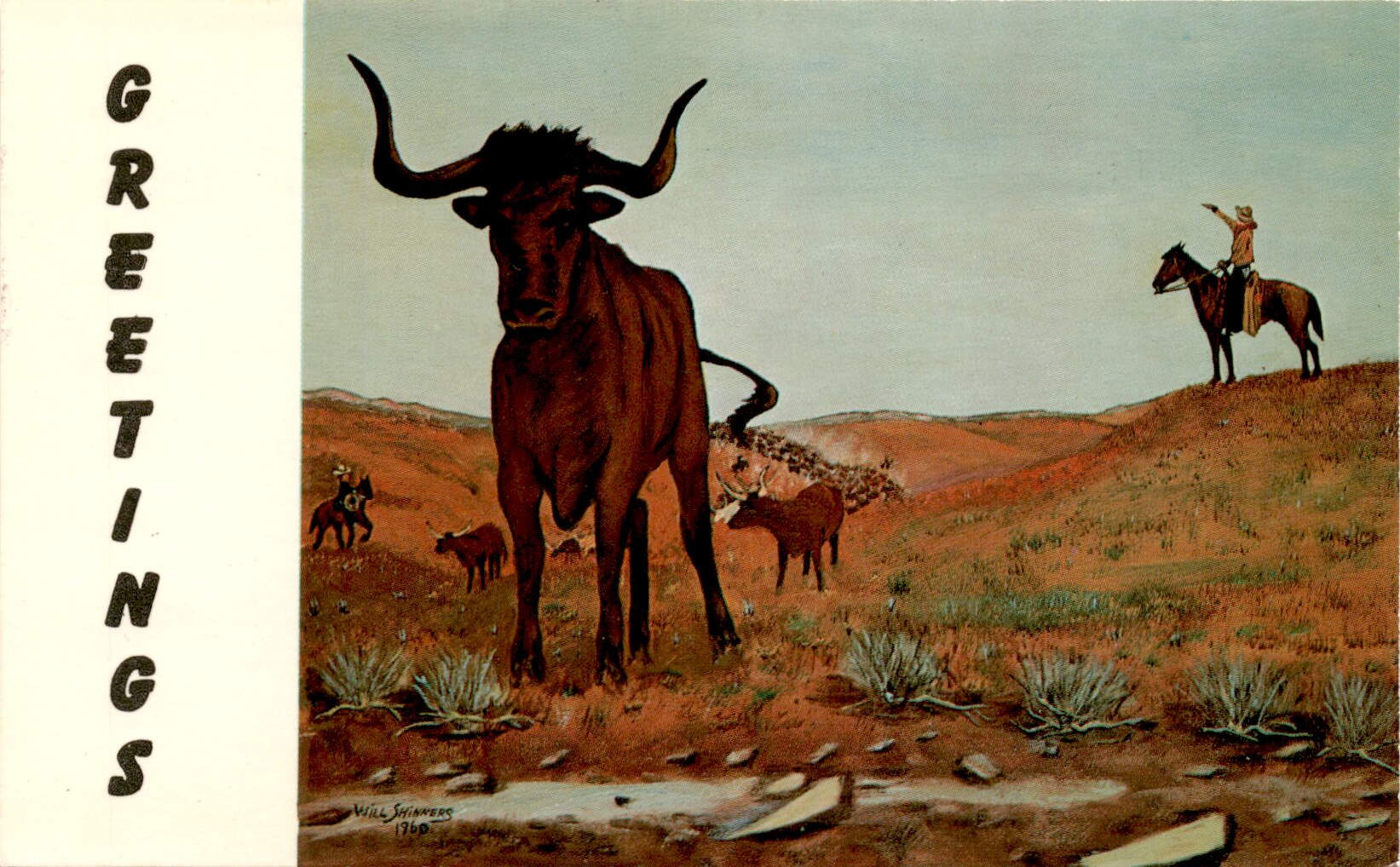 Back of PostcardThe front of this postcard features an original oil painting by Will Shinners titled “The Point Riders.” The painting depicts cowboys on horseback leading a trail herd, with a mossy horn steer at the front of the group. The point riders, as they were known, were responsible for leading the herd and setting the pace for the rest of the cowboys. The artwork captures a glimpse of the cowboy lifestyle and the important role of the point riders in cattle drives.