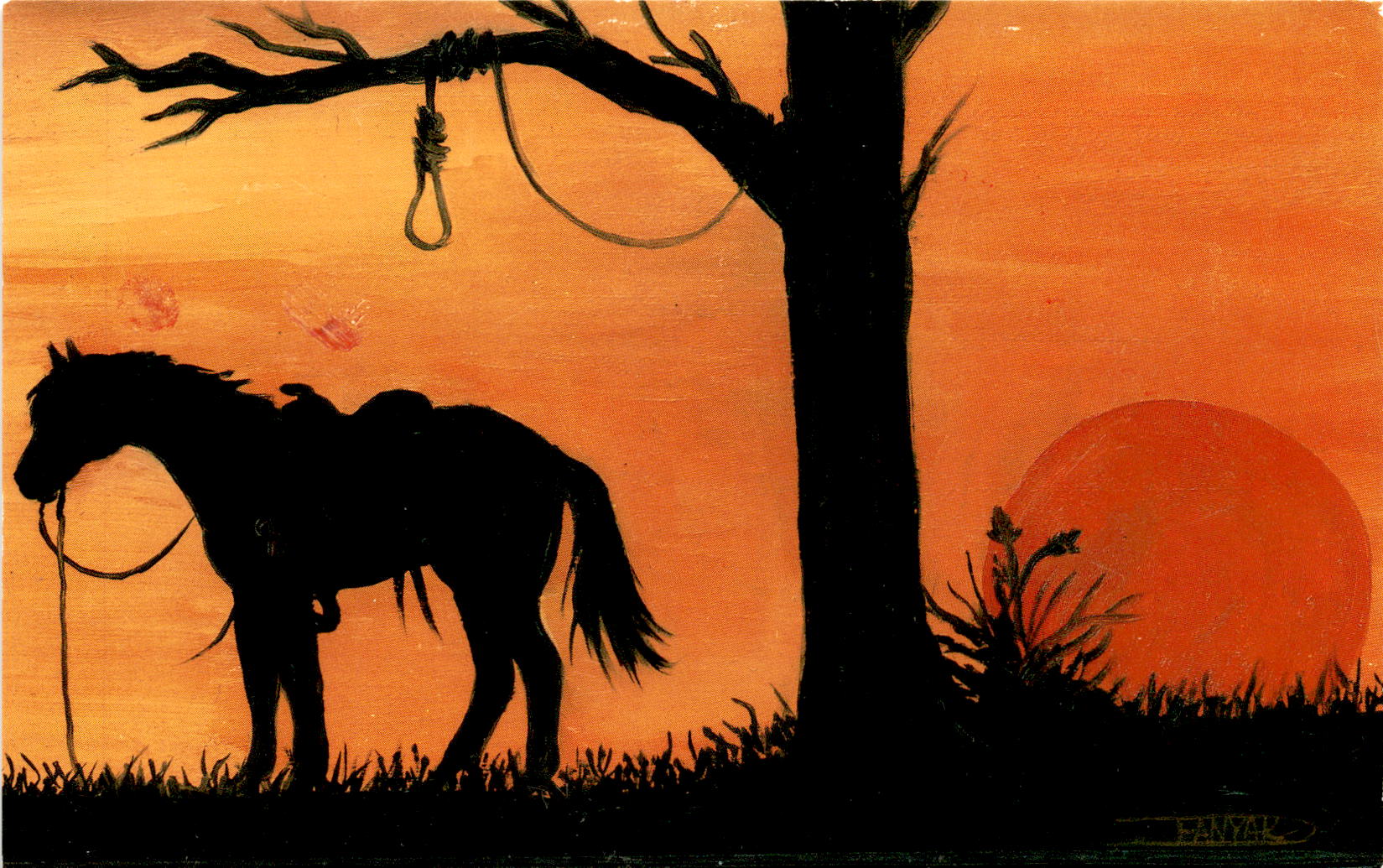 The front of this postcard features an artist’s conception of “The Hanging Tree” on Main Street in Roundup, Montana. The image is created by artist Donna Fanyak and depicts a historical landmark in the town. The Hanging Tree is a significant piece of Roundup’s history, as it was used for public executions in the late 1800s. The tree served as a grim reminder of the town’s Wild West past and is now a popular tourist attraction.