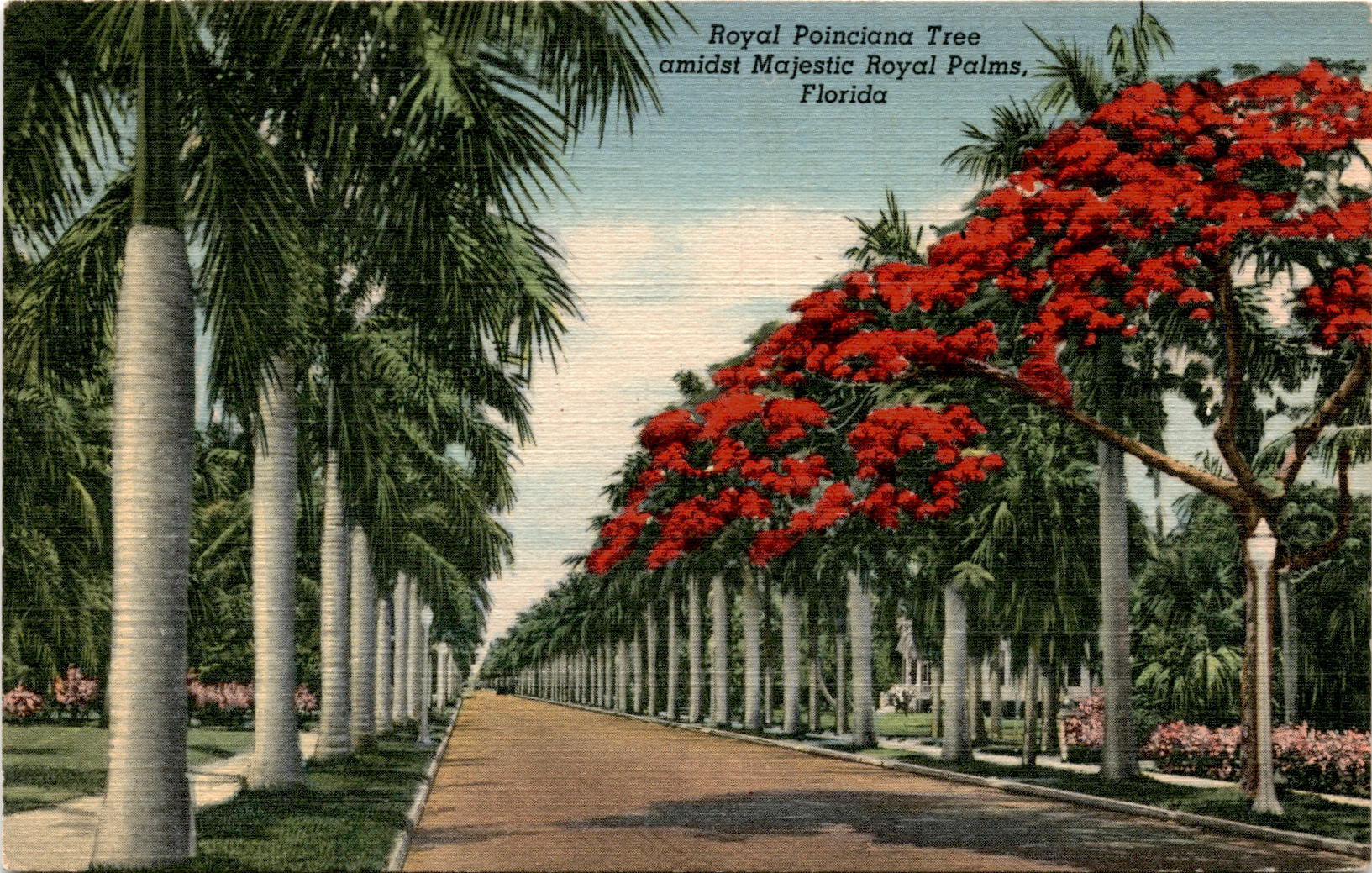 The front of the postcard features a beautiful Royal Poinciana Tree surrounded by Majestic Royal Palms in Florida. The postmark on the card is from Dunedin, Florida in 1947. The image captures the essence of the tropical beauty of the state, with its lush greenery and vibrant flowers. The Royal Poinciana Tree is known for its striking red-orange flowers and is a popular ornamental tree in Florida.