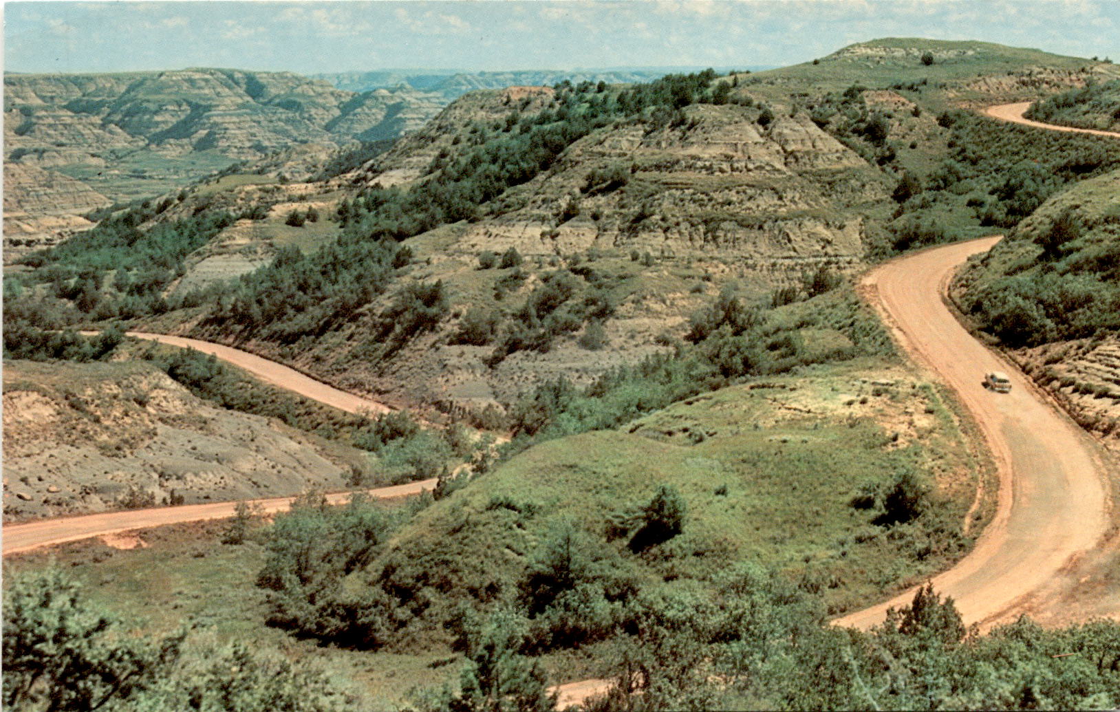 The front of this postcard showcases a picturesque drive leading to Lookout Point in the north section of Theodore Roosevelt National Memorial Park. The winding road is surrounded by lush greenery and offers a stunning view of the park’s natural beauty. The image captures the essence of the park’s peaceful and serene atmosphere, making it a must-visit destination for nature lovers and outdoor enthusiasts.On the back of the postcard, we see the publisher information from Bert Nauer Enterprises in Jamestown, North Dakota. The postcard was made by Dexter Press, Inc. in West Nyack, New York, showcasing the collaboration between different companies to capture and share the beauty of Theodore Roosevelt National Memorial Park. The postcard serves as a memento for visitors to remember their time exploring the park and serves as a way to share the park’s beauty with others.The postcard serves as a reminder of the importance of preserving and protecting natural spaces like Theodore Roosevelt National Memorial Park. It highlights the beauty of the park’s landscapes and encourages people to visit and experience the wonders of nature firsthand. The image on the postcard captures the essence of the park, inviting viewers to imagine themselves taking a leisurely drive to Lookout Point and soaking in the breathtaking views. Theodore Roosevelt National Memorial Park is a true gem of North Dakota, and this postcard serves as a beautiful representation of its natural splendor.