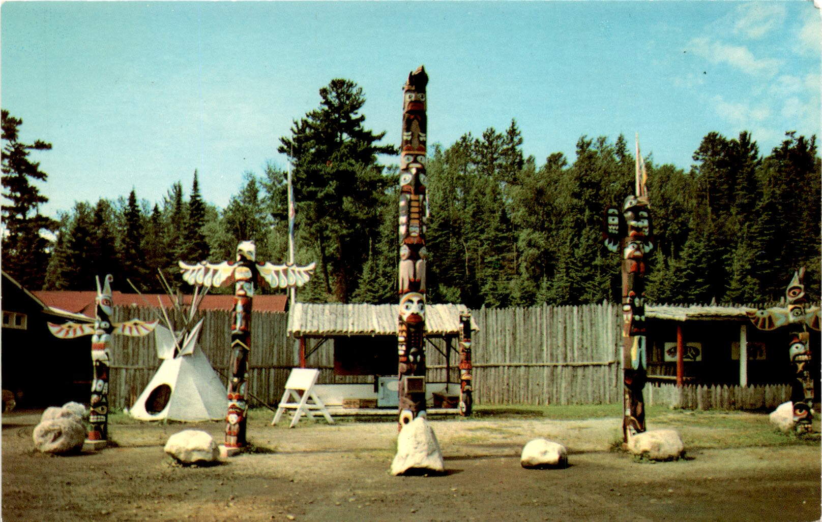 The front of this postcard features a photo of the largest collection of authentic handcarved totem poles east of the Rockies, located at The Narrows Ltd. in Sioux Narrows, Ontario. The totem poles are a significant cultural and artistic symbol for Indigenous peoples in Canada, representing stories, traditions, and beliefs. The intricate carvings and vibrant colors of the totem poles make them a popular tourist attraction and a unique piece of Canadian heritage.