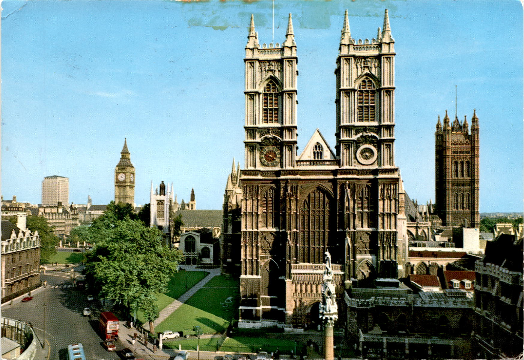 The front of the postcard features a beautiful image of Westminster Abbey in London, a historic site that has been the location of coronations for centuries and the burial place of many notable figures. The abbey dates back to 1042 and is a stunning example of Gothic architecture. It is a must-visit for anyone interested in British history and architecture.