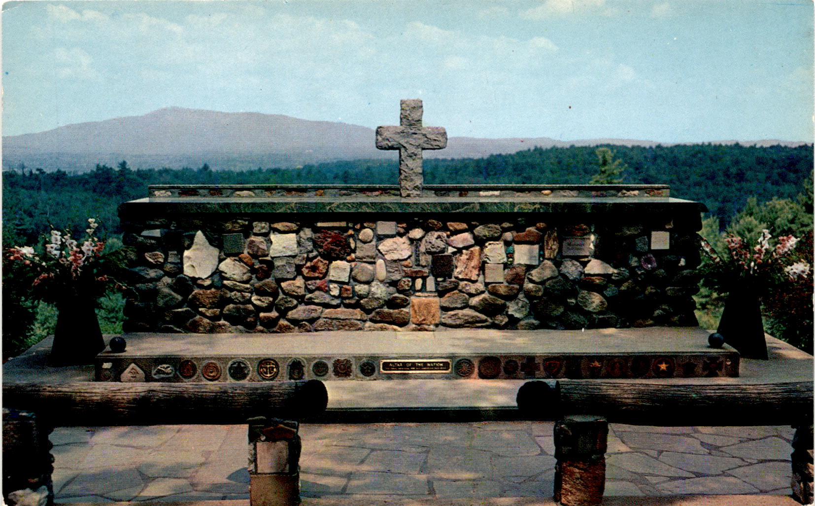 The postcard features the Altar of the Nation at the Cathedral of the Pines in Rindge, New Hampshire. This National War Memorial is dedicated to all American war dead, making it a significant and solemn place of remembrance. The image on the postcard captures the peaceful and serene atmosphere of the cathedral, inviting visitors to reflect on the sacrifices made by those who served in the military.The Cathedral of the Pines is a popular destination for visitors seeking a place of tranquility and reflection. The stunning natural beauty of the surroundings adds to the peaceful ambiance of the memorial site. The postcard serves as a reminder of the importance of honoring and remembering those who have given their lives in service to their country.The use of the Plastichrome technology by the Natural Color Company, Inc. in Boston, Massachusetts, enhances the vibrant colors and details of the image on the postcard. This technology allows for a high-quality reproduction of the Altar of the Nation, capturing the essence of the memorial in a way that can be shared with others. The postcard serves as a tangible reminder of the sacrifices made by American service members and the importance of honoring their memory.