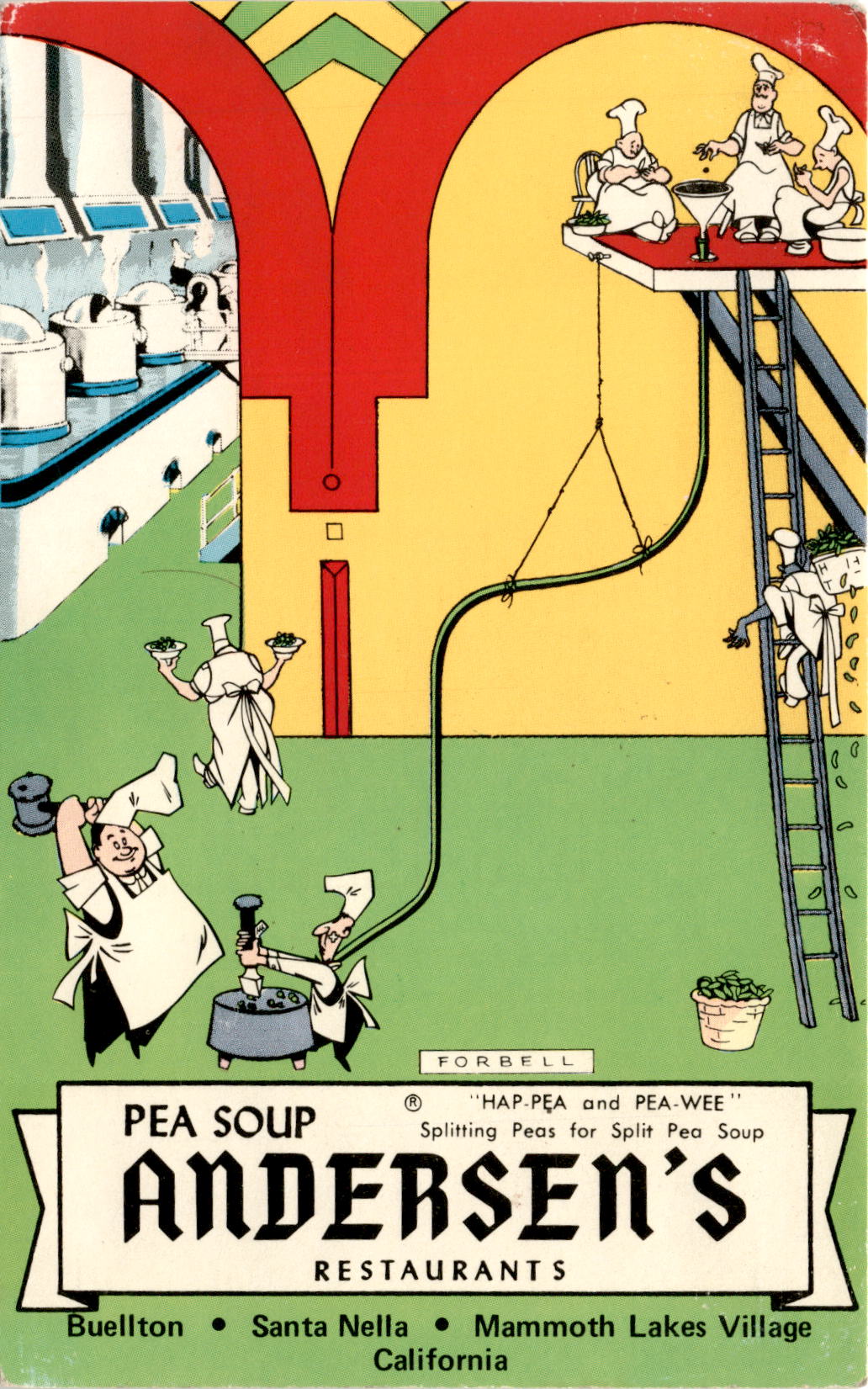 The postcard features a charming illustration of two chefs, Hap-Pea and Pea-Wee, splitting peas for Andersen’s famous pea soup. Andersen’s Restaurants in California are known for their carefully selected peas and delicious split pea soup, which is a specialty at their locations in Buellton, Santa Nella, and Mammoth Lakes Village. The postcard captures the essence of this iconic dish and the dedication of the chefs who personally prepare the peas.Andersen’s Restaurants have become a beloved destination for those traveling along U.S. Highway 101, Interstate 5, and in the High Sierras. The locations in Buellton, Santa Nella, and Mammoth Lakes Village offer a taste of California cuisine with their renowned pea soup. The postcard serves as a reminder of the culinary delights that await visitors at Andersen’s, where the tradition of splitting peas for soup has been passed down through generations.The vintage postcard, printed in 1976 by Kolor View Press in Los Angeles, captures a nostalgic glimpse of a bygone era. The whimsical illustration of Hap-Pea and Pea-Wee evokes a sense of warmth and hospitality that is synonymous with Andersen’s Restaurants. Whether you’re a fan of split pea soup or simply appreciate the art of traditional cooking, this postcard is a delightful memento of a culinary tradition that has stood the test of time.