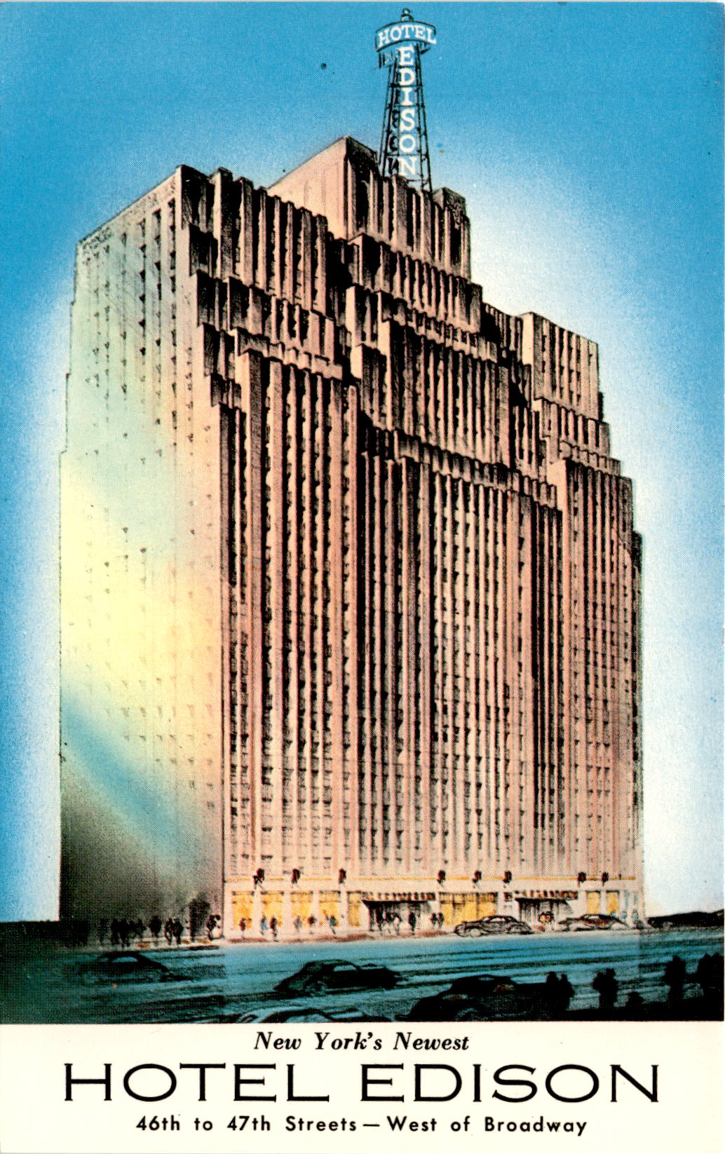 The Hotel Edison in New York City is a luxurious accommodation option located on 46th to 47th Streets just west of Broadway. With 1000 rooms, each equipped with a bath and shower, radio, television, air conditioning, and circulating ice water, guests are sure to have a comfortable stay. The hotel also boasts three fine restaurants, banquet accommodations, and a Green Room known for hosting famous orchestras.Owned by Milton J. Kramer, the Hotel Edison is a popular choice for visitors to the city, offering top-notch amenities and services. The postcard showcases the grandeur of the hotel, with its elegant design and modern conveniences. With all public rooms air-conditioned, guests can relax and unwind in style during their stay.For those looking to experience the best of New York City, the Hotel Edison is a prime location to stay. With its central location near Broadway and top-notch facilities, guests can enjoy a memorable and comfortable visit to the city that never sleeps. Whether attending a show, exploring the sights, or simply relaxing in luxury, the Hotel Edison is the perfect choice for a stay in the Big Apple.