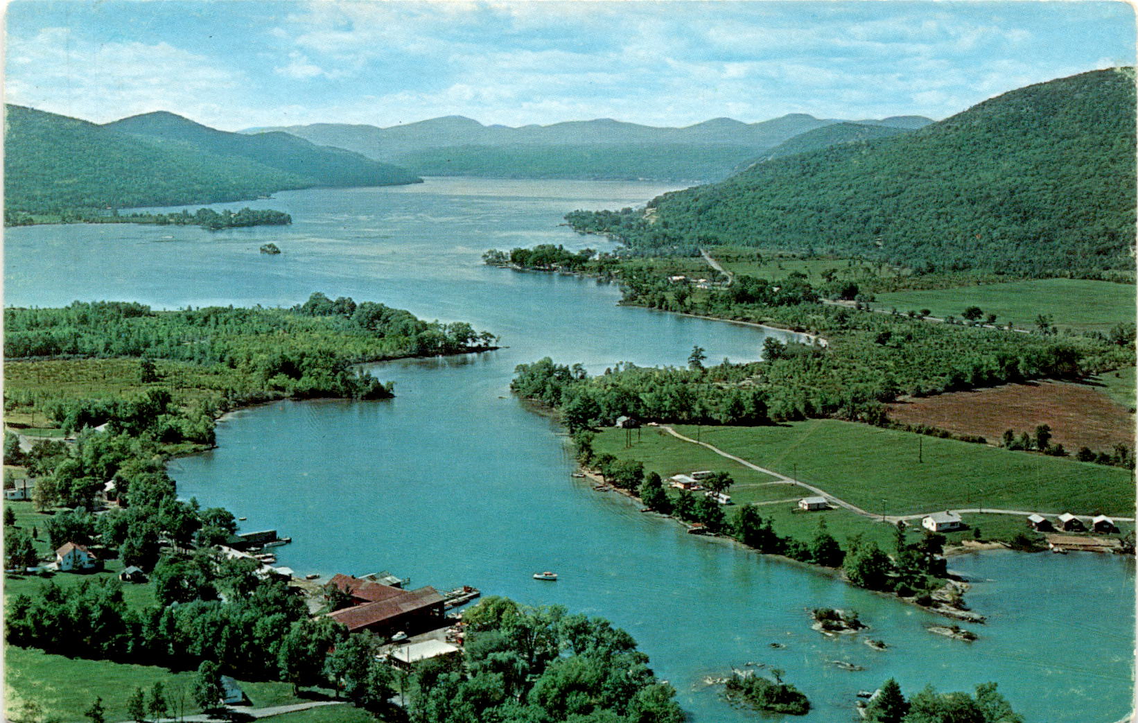 Lake George, postcard, aerial view, Ticonderoga, N.Y., Riffles, Dean Postcard