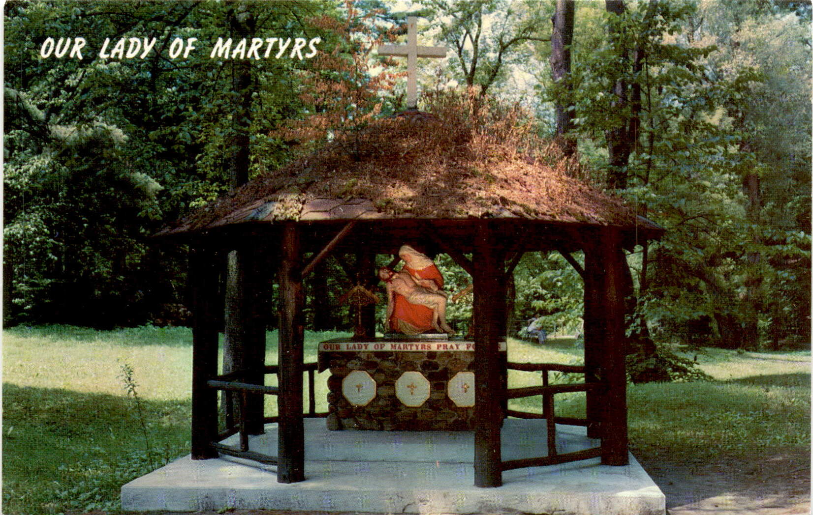The postcard features a stunning image of Our Lady of Martyrs, holding the Body of the Crucified Savior, set in a rustic setting in the Ravine at the Shrine of the North American Martyrs in Auriesville, New York. This shrine is a significant historical site, dedicated to the memory of the eight Jesuit missionaries who were martyred in the 17th century. These martyrs, known as the North American Martyrs, were killed by members of the Iroquois tribe for their efforts to convert Native Americans to Christianity. The shrine serves as a place of pilgrimage and prayer for those seeking to honor the memory of these brave individuals.The postcard was created by Joe Connors, a well-known postcard artist from Averill Park, New York. Connors was known for his detailed and beautiful depictions of religious scenes and landmarks, and his work has become highly collectible among postcard enthusiasts. The image of Our Lady of Martyrs on this postcard captures the serene and spiritual atmosphere of the shrine, inviting viewers to reflect on the sacrifices made by the North American Martyrs in the name of their faith.Visiting the Shrine of the North American Martyrs in Auriesville is a powerful experience, as it allows visitors to connect with the history of early Christian missionaries in North America. The site is a reminder of the challenges and dangers faced by those who sought to spread the message of Christianity to indigenous peoples, and it serves as a testament to the enduring legacy of faith and sacrifice. Our Lady of Martyrs, depicted on this postcard, stands as a symbol of hope and inspiration for all who visit the shrine and pay tribute to the martyrs who gave their lives for their beliefs.