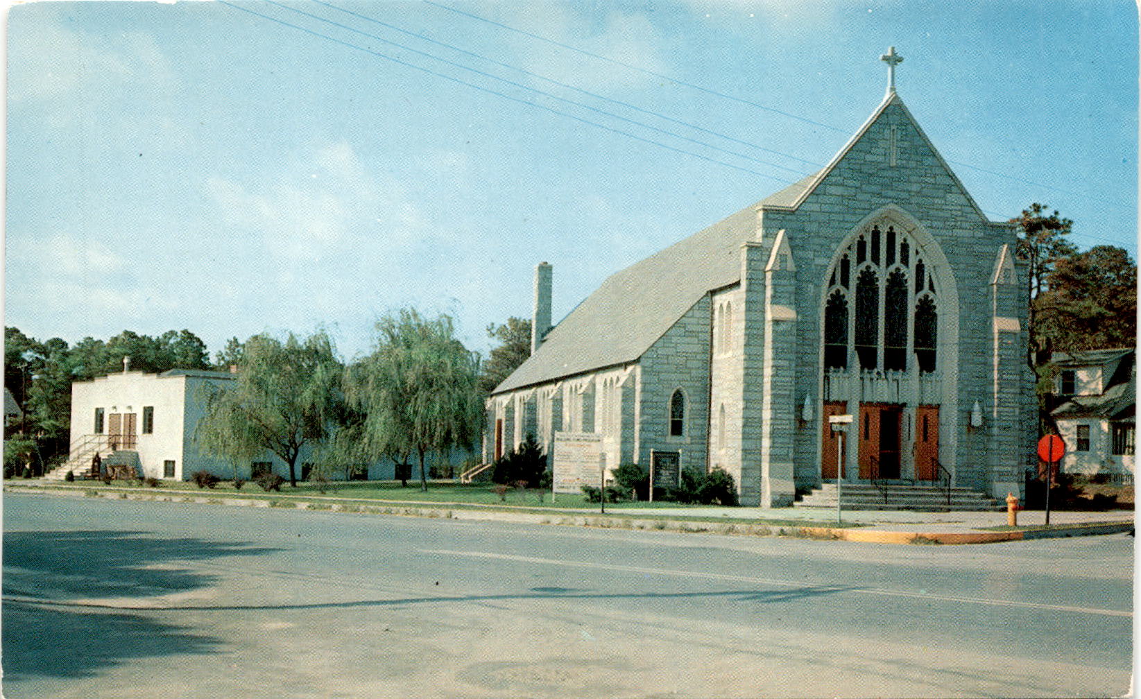 The postcard featuring St. Edmonds R.C. Church and School in Rehoboth Beach, Delaware is a charming glimpse into the history of the area. The church and school, opened in 1955, hold the distinction of being the first Catholic school in Sussex County, Delaware. The Rev. Francis J. Desmond served as the Rector, overseeing the growth and development of the church and school in the community.Rehoboth Beach itself is a popular seaside town known for its beautiful beaches and vibrant boardwalk. The presence of St. Edmonds R.C. Church and School adds a touch of historical significance to the area, showcasing the importance of faith and education in the community. The postcard, with its colorful depiction of the church and school, serves as a reminder of the rich history and traditions that have shaped Rehoboth Beach over the years.The postcard was published by Rodgers Record & Photo Shop in Rehoboth Beach, and features the work of C. H. Ruth in capturing the vibrant colors of the scene. The Plastichrome printing by COLOURPICTURE PUBLISHERS, INC. in Boston further enhances the beauty of the image. This postcard is not only a lovely memento of St. Edmonds R.C. Church and School, but also a piece of history that reflects the importance of faith, education, and community in Rehoboth Beach, Delaware.