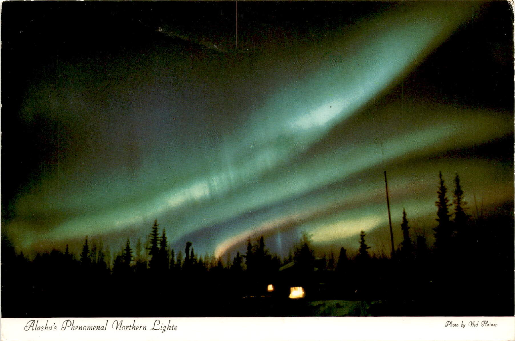 Alaska’s Phenomenal Northern Lights are captured in this stunning postcard from August 2, 1986. The photo by Med Haines showcases the beauty of the Aurora Borealis, a natural wonder that lights up the night sky in Alaska during the winter months. The message on the back of the postcard is addressed to Teresa and Charlie Fox, with love from Margaret and Mary who are braving the cold and rain in Rupert.The postcard captures the magic of Alaska’s Aurora Borealis, a sight that never fails to amaze those who witness it. The sender mentions the rainy and cold weather, but still expresses their excitement for the journey to Rupert the next day. The postcard serves as a reminder of the beauty and wonder of nature, even in the harshest of conditions.As the postcard makes its way from Alaska to Southbend, Indiana, it serves as a token of love and connection between friends. The sender’s message, along with the stunning photo of the northern lights, is a testament to the power of nature to inspire awe and bring people together. The postcard is a snapshot of a moment in time, frozen in history for the recipients to cherish and remember.