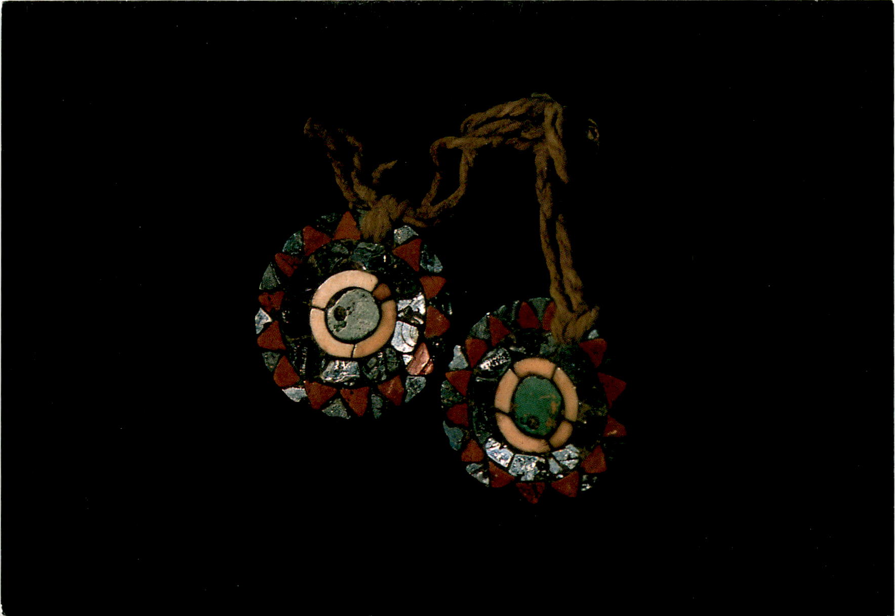The postcard features a stunning image of inlaid disks found at Balcony House in Mesa Verde National Park. These disks, decorated with burnt shale, hematite, turquoise, and shell, are tied with original cotton yarn. The intricate design and vibrant colors of the disks showcase the craftsmanship and artistry of the ancient Pueblo people who once inhabited the area.The photo on the postcard, taken by Paul Myers, captures the beauty and detail of the inlaid disks, providing a glimpse into the rich history and culture of Mesa Verde National Park. The artifact series highlighted on the postcard offers a unique opportunity to learn more about the archaeological treasures found within the park, shedding light on the daily lives and traditions of the ancestral Puebloans.As a souvenir from Mesa Verde National Park, this postcard serves as a reminder of the fascinating archaeological discoveries and cultural heritage preserved within the park. The inlaid disks featured on the postcard are not only a testament to the artistic skills of the ancient Pueblo people, but also a symbol of the enduring legacy of their civilization. Whether displayed as a memento or shared with others, this postcard offers a glimpse into the rich history and vibrant culture of Mesa Verde National Park.