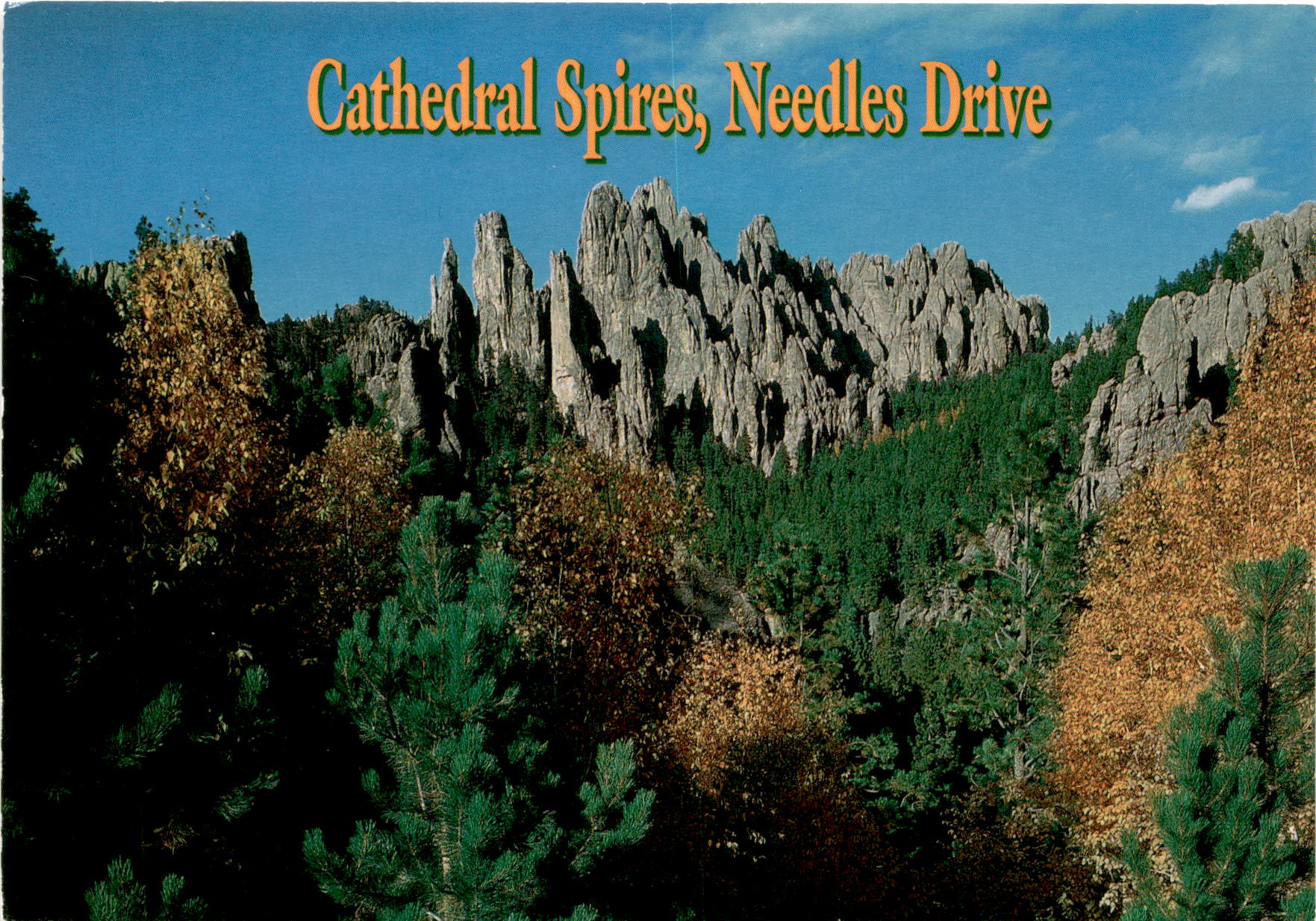 The postcard features a stunning image of Cathedral Spires on Needles Drive in the Black Hills of South Dakota. The rock formations, which have weathered for centuries, appear to reach for the heavens, giving them their fitting pseudonym. The photo, taken by John and Jill Sundby, captures the beauty and grandeur of the granite peaks in the Black Hills.The back of the postcard provides more information about the photo, including the location and the photographers. It also includes a barcode and space reserved for the U.S. Postal Service. The postcard serves as a beautiful memento of the natural wonders found in South Dakota, and would make a great addition to any postcard collection.Overall, the postcard showcases the breathtaking beauty of Cathedral Spires on Needles Drive in the Black Hills. The image captures the essence of the rock formations as they stand tall and majestic against the backdrop of the South Dakota landscape. Whether sent as a souvenir or kept as a keepsake, this postcard is sure to inspire awe and wonder in all who see it.