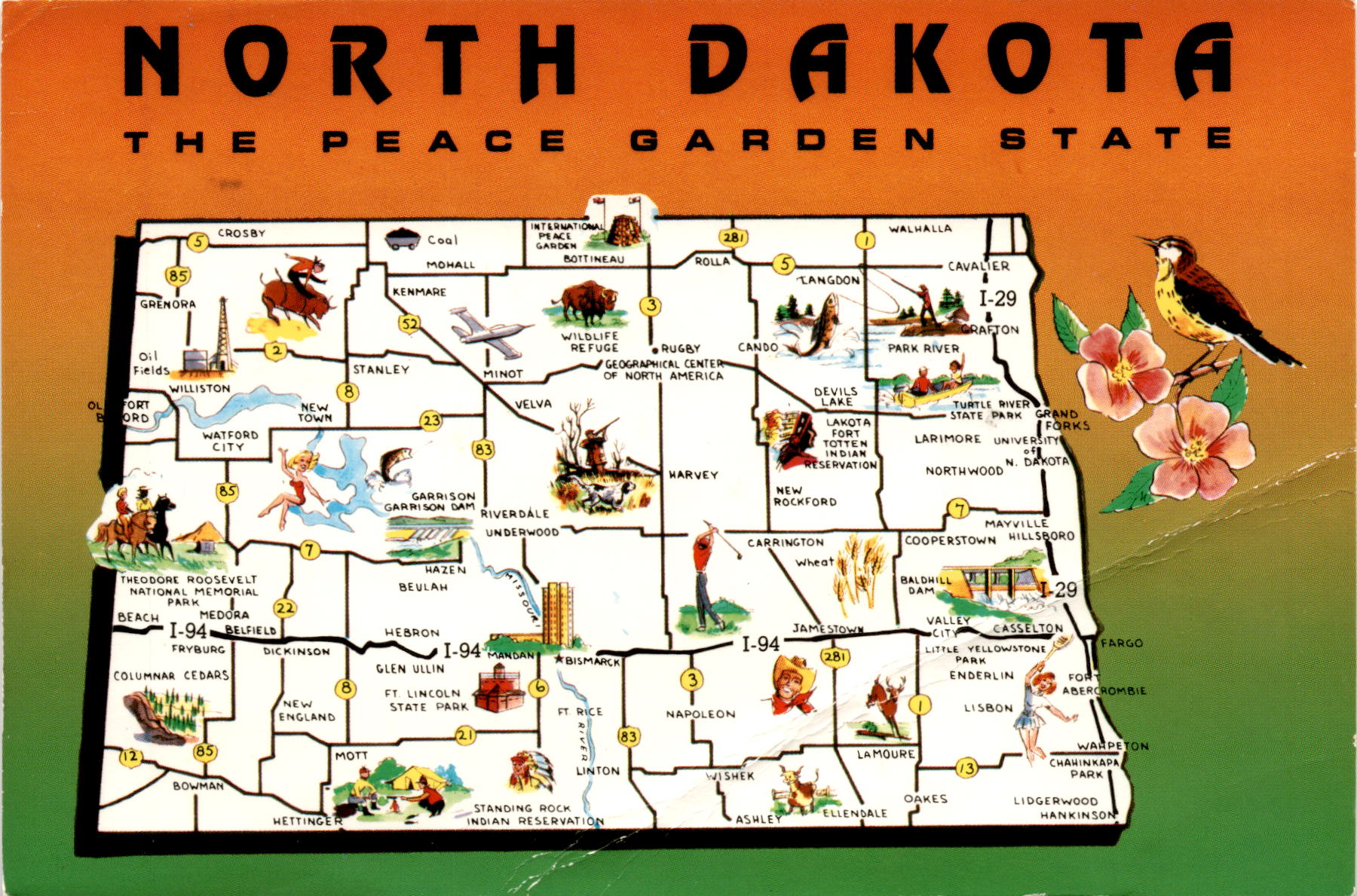 The postcard showcases the beauty and attractions of North Dakota, known as The Peace Garden State. From the oil fields of Grenora to the International Peace Garden in Bottineau, the postcard highlights various landmarks and points of interest across the state. The back of the postcard provides additional information about North Dakota, including its capital (Bismarck), area (70,665 sq. mi.), population (632,446), motto (Liberty and Union, Now and Forever, One and Inseparable), and state symbols such as the Prairie Rose flower, Western Meadowlark bird, and Elm tree.North Dakota’s rich history and natural beauty are evident in the postcard, with mentions of landmarks like the Theodore Roosevelt National Memorial in Medora and the geographical center of North America in Rugby. The postcard also features key cities and regions in North Dakota, such as Fargo, Grand Forks, and the Standing Rock Indian Reservation. The diverse landscapes and attractions of North Dakota make it a unique and intriguing destination for travelers looking to explore the heartland of America.Overall, the postcard serves as a visual representation of North Dakota’s charm and character, inviting viewers to discover the state’s hidden gems and iconic landmarks. Whether it’s the peaceful surroundings of the International Peace Garden or the bustling city life of Bismarck, North Dakota offers a mix of experiences for visitors to enjoy. With its picturesque landscapes and rich cultural heritage, North Dakota truly lives up to its nickname as The Peace Garden State.