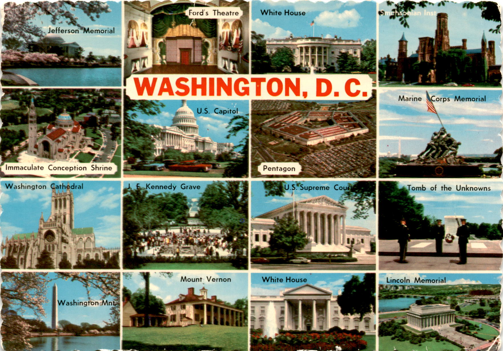 Jefferson Memorial, Ford’s Theatre, White House, U.S. Capitol postcard Postcard