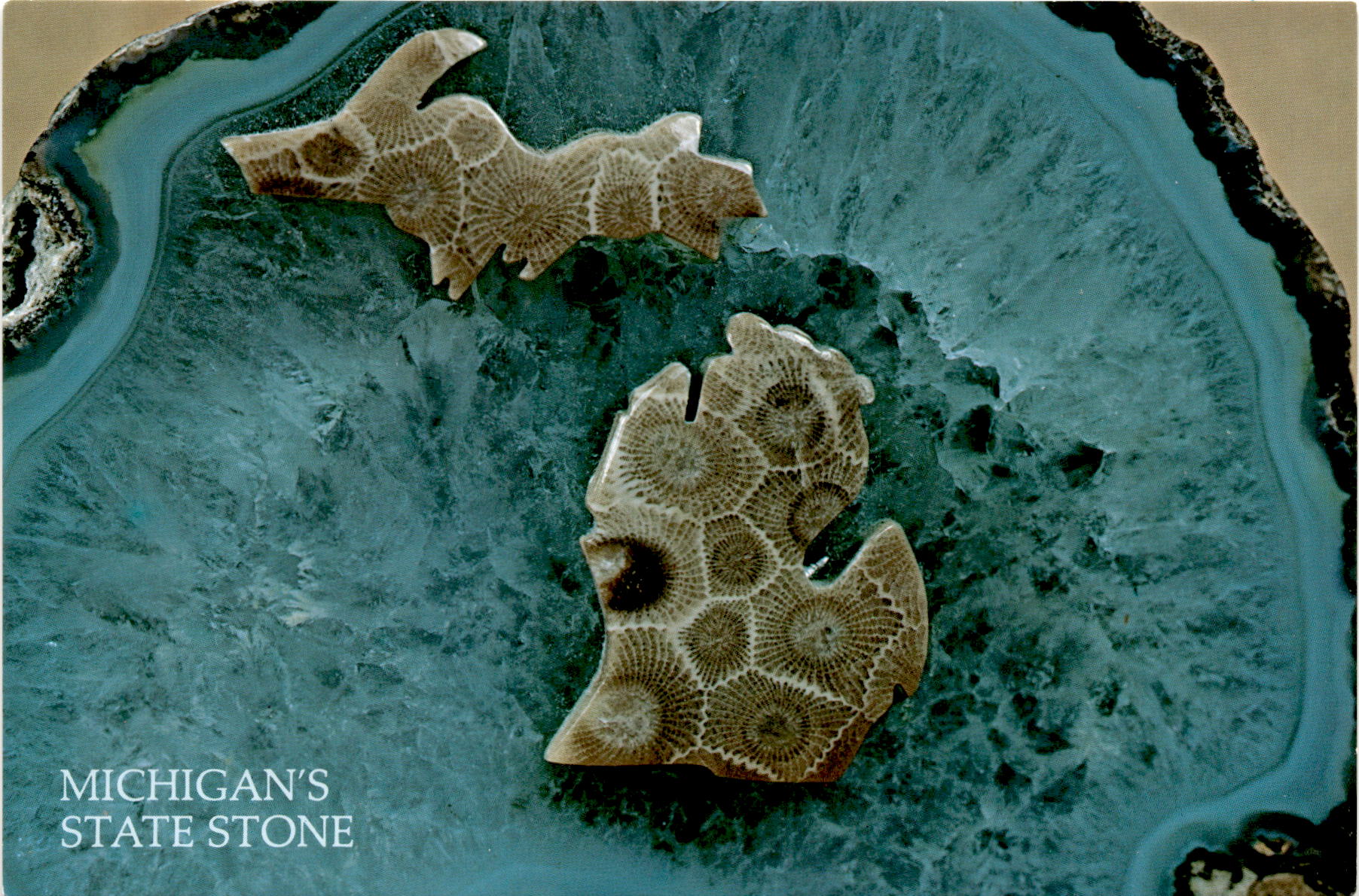 I recently received a postcard featuring Michigan’s state stone, the Petoskey Stone. The postcard showcases a beautiful photo of the stone, which can be found along the shores of Michigan’s Lower Peninsula and in glacial drift throughout the region. Known for its unique pattern resembling fossilized coral, Petoskey Stones are often used for making jewelry and ornaments.The back of the postcard features the photo credit to John Penrod and contact information for Openrod/Hiawatha Co. in Berrien Center, Michigan. The company can be reached at 616-461-6993. This postcard serves as a reminder of the natural beauty and geological wonders that can be found in Michigan, making it a perfect souvenir for tourists or a lovely keepsake for residents of the state.Overall, this postcard is a wonderful tribute to Michigan’s state stone and a great way to showcase the beauty of the Petoskey Stone. Whether you are a collector of unique stones or simply appreciate the natural wonders of the world, this postcard is sure to be a cherished item. It serves as a reminder of the diverse landscapes and geological treasures that can be found in the Great Lakes State.