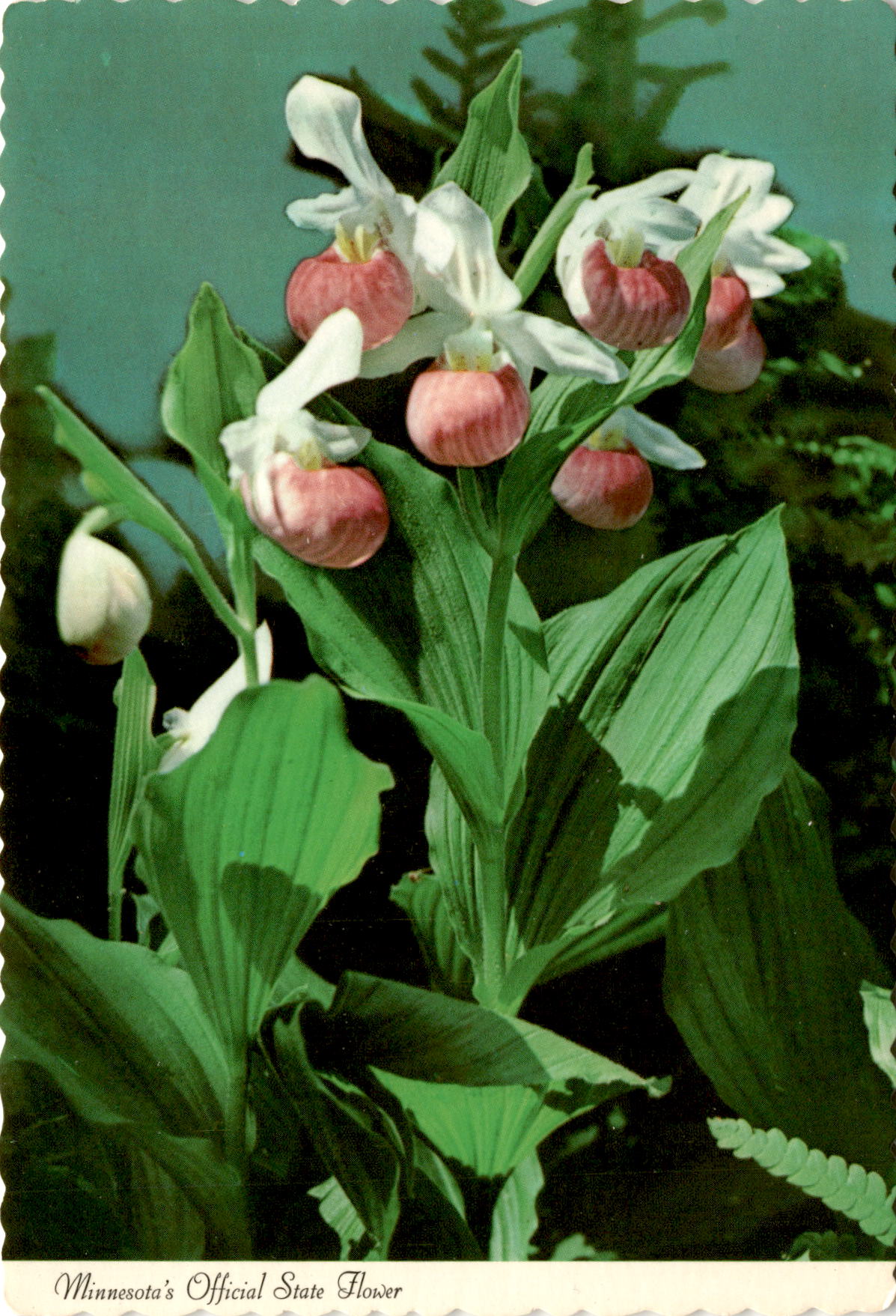 Back of PostcardThe postcard features Minnesota’s official state flower, the Showy Lady Slipper, also known as the Orchid of the North. This pink and lavender flower is a symbol of the wilderness and can be found in the cool, dense forests and swamps of Northern Minnesota. Despite becoming rare, the Showy Lady Slipper still thrives in secluded areas in the state.The front of the postcard showcases a beautiful image of the Showy Lady Slipper, highlighting its unique and delicate beauty. The back of the postcard provides information about the flower and its significance as Minnesota’s official state flower. The postcard serves as a reminder of the natural beauty and biodiversity found in Minnesota’s landscapes.Overall, the postcard captures the essence of Minnesota’s natural beauty and serves as a reminder of the importance of preserving and protecting native flora and fauna. The Showy Lady Slipper is a symbol of the state’s wilderness and serves as a reminder of the unique and diverse ecosystems found in Minnesota. This postcard is a beautiful memento for nature lovers and those who appreciate the beauty of the great outdoors.