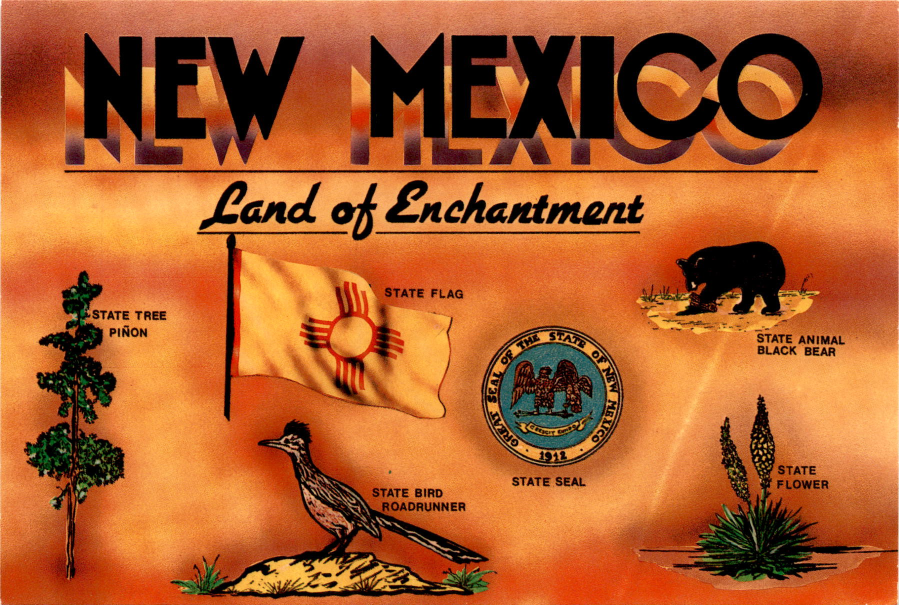 The postcard from New Mexico showcases the state’s unique symbols, including the state tree, the piñon, and the state bird, the roadrunner. These symbols represent the rich culture and natural beauty of the Land of Enchantment. The postcard also features the state seal and the state animal, the black bear, giving recipients a glimpse into the diverse wildlife that can be found in New Mexico.The front of the postcard is adorned with colorful illustrations of the state symbols, while the back provides information about each one. From the state flower to the state flag, the postcard serves as a mini lesson on the iconic emblems of New Mexico. The postcard is a perfect souvenir for anyone visiting or interested in learning more about this southwestern state.Whether you’re a collector of postcards or simply a fan of New Mexico, this postcard is a delightful addition to any collection. The vibrant illustrations and informative text make it a fun and educational keepsake. Greetings from New Mexico, where the state’s symbols come to life on this charming postcard.