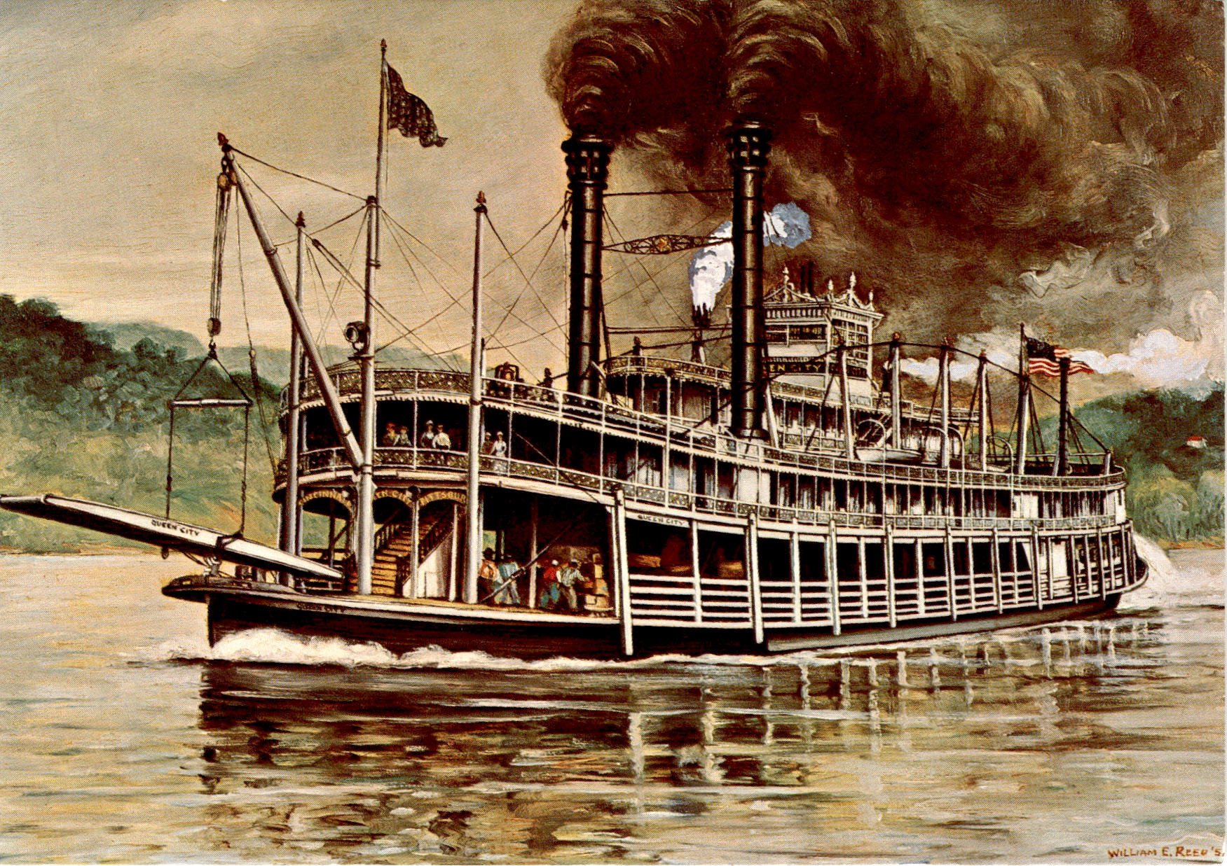 The Queen City postcard showcases the grandeur of the Queen City river bid, which was a popular choice for summertime vacation travel on the Great Lakes. The postcard features a painting by William E. Reed, highlighting the luxurious accommodations of the Queen City, including a burnished mahogany cabin, grand piano, and harp. Despite its relatively modern times, the Queen City was able to maintain its elegance and charm.The front of the postcard displays a beautiful painting of the Queen City, while the back provides information about the exclusive distribution by Lenharts in Marietta, Ohio. The postcard was printed by Richardson Printing Corp. in 1973, adding to its historical significance. The Queen City postcard serves as a reminder of the opulence and sophistication of river bids during that time period.Overall, the Queen City postcard offers a glimpse into the past, showcasing the luxurious accommodations and grandeur of river bids for summertime vacation travel. The detailed painting by William E. Reed captures the essence of the Queen City, a Grand Lady that was able to survive until relatively modern times. This postcard serves as a valuable piece of history, preserving the memory of the Queen City for future generations to appreciate.