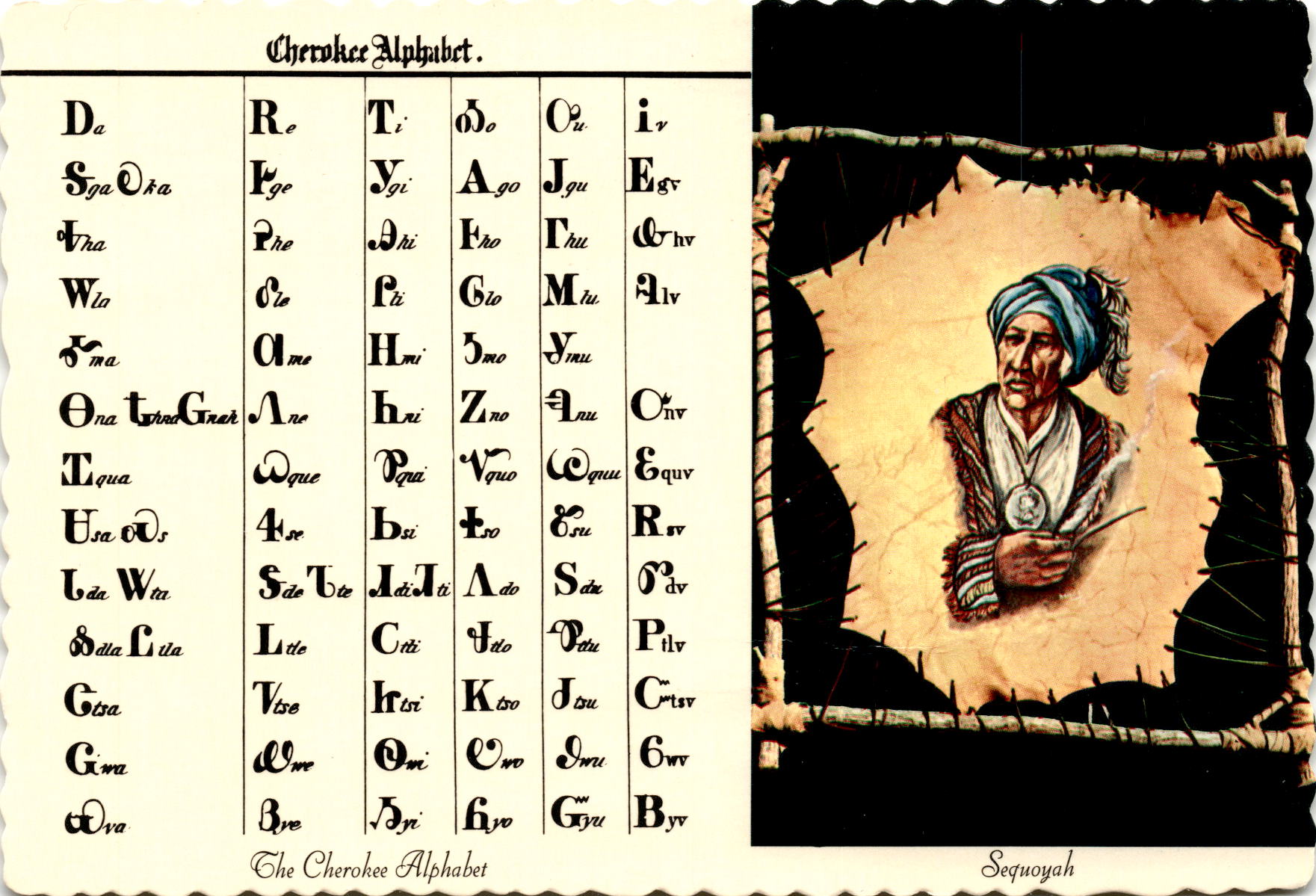 The postcard features the Cherokee Alphabet, showcasing the unique characters created by Sequoyah, who is known as the inventor of the Cherokee alphabet. Sequoyah, born in Tennessee between 1760 and 1770, developed the 85-character syllabary over a 12-year period after recognizing the advantages of a written language. His creation allowed Cherokees to communicate and stay connected during the difficult years of removal to the west, with the first Cherokee-language newspaper, The Cherokee Phoenix, being published in 1828.Sequoyah’s impact on his people was profound, as his new written language provided a means for Cherokees to preserve their culture and heritage. The postcard serves as a reminder of Sequoyah’s legacy and the importance of language in maintaining connections and traditions. The artwork on the postcard, created by artist Redbird and published by STORER’S CARDS in Tulsa, Oklahoma, captures the essence of the Cherokee Alphabet and pays tribute to Sequoyah’s contribution to the Cherokee people.The Cherokee Alphabet postcard is not just a piece of paper but a symbol of resilience and cultural preservation. It serves as a testament to the power of language and the impact one individual can have on their community. Sequoyah’s dedication to creating a written language for the Cherokee people continues to be celebrated and remembered through artifacts like this postcard, keeping his legacy alive for generations to come.