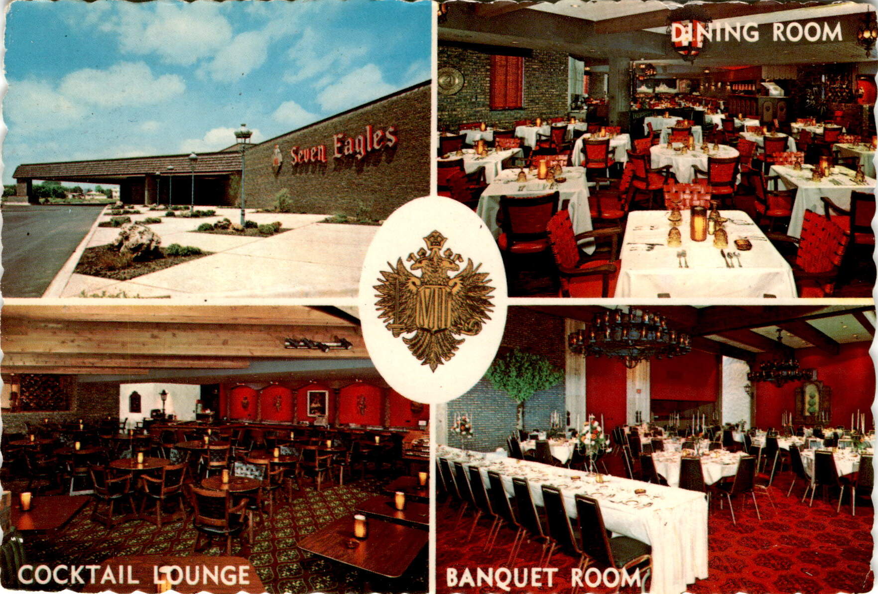 Back of PostcardLocated in the Northwest suburbs of Illinois, Seven Eagles is known as the most luxurious restaurant in the area. With a dining room, cocktail lounge, and banquet room, Seven Eagles offers a variety of options for guests to enjoy. The restaurant features Continental cuisine and can accommodate banquet facilities for up to 400 people.Guests can enjoy nightly entertainment in the cocktail lounge while also indulging in a delicious luncheon. Conveniently located just 5 minutes from the Kennedy Expressway, Seven Eagles is easily accessible for those looking to dine in style. The address, 1050 W. Oakton, is just 2 blocks west of Mannheim Rd. (U.S. Rt. 45) in Des Plaines, Illinois.The postcard, made by Dexter Press, Inc. in West Nyack, New York, showcases the elegance and sophistication of Seven Eagles. With a picturesque image on the front and detailed information on the back, this postcard is the perfect way to invite friends and family to experience the luxury of Seven Eagles. Whether for a special occasion or a night out, Seven Eagles promises a memorable dining experience for all who visit.