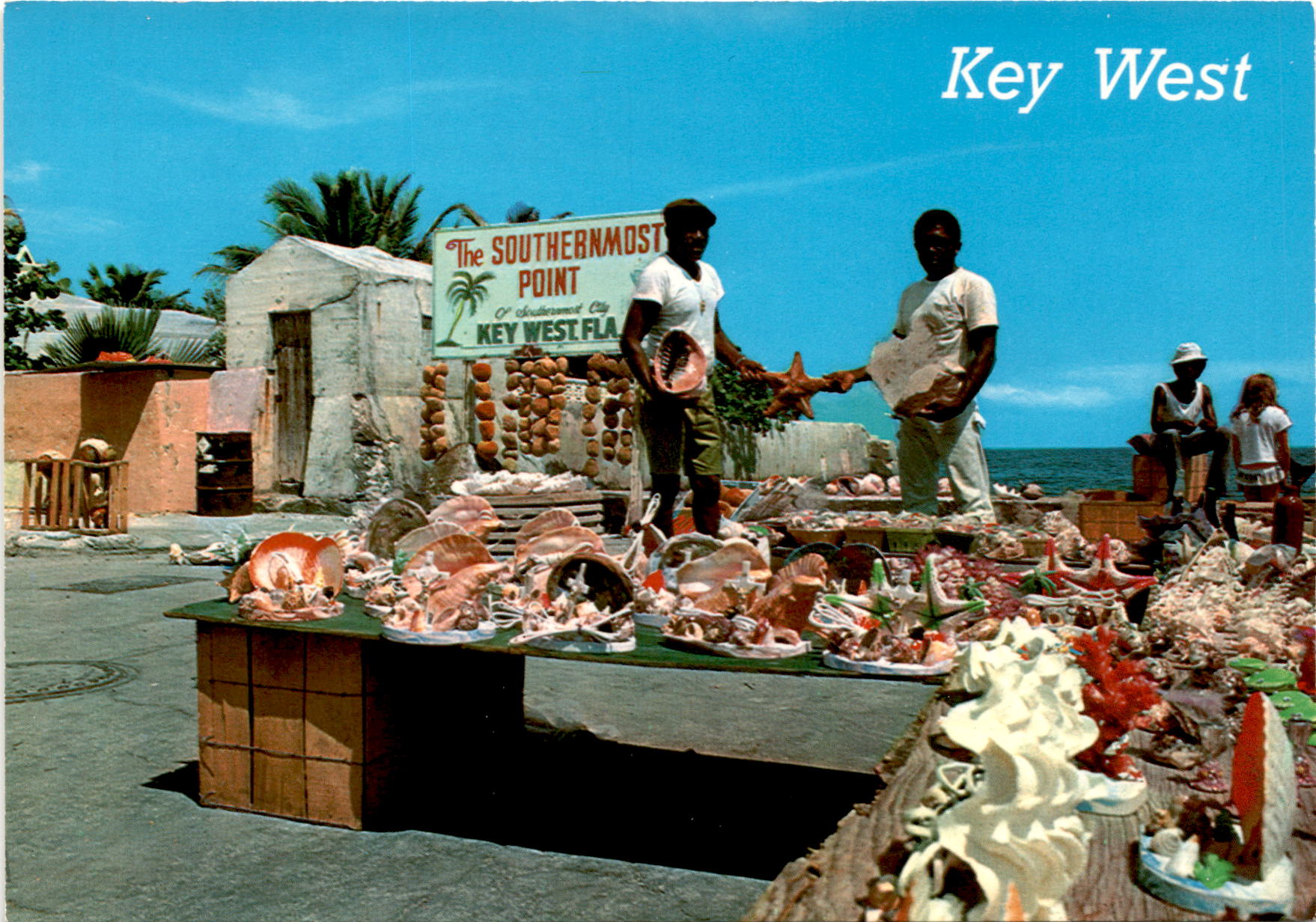 The postcard depicts the iconic Southernmost Point in Key West, Florida, where Julian Key and his son Al Key showcase their collection of conch shells and other sea treasures. Located at Whitehead and South Streets, this spot is a popular tourist attraction that draws large crowds eager to see the unique marine artifacts on display. The vibrant colors and bustling atmosphere captured in the postcard give a glimpse into the lively energy of this southernmost point in the Continental U.S.Visitors to Key West can experience the charm and beauty of the Florida Keys by exploring the Southernmost Point and taking in the sights and sounds of the bustling tourist scene. The postcard serves as a memento of the vibrant culture and natural wonders found in this tropical paradise, with images of sponges, corals, and other sea oddities that are sure to spark curiosity and wonder in those who receive it. The Southernmost Point is not just a geographical landmark, but a symbol of the rich history and unique offerings of Key West.Whether you’re a seasoned traveler or a first-time visitor, the Southernmost Point in Key West is a must-see destination that offers a glimpse into the beauty and charm of the Florida Keys. The postcard serves as a reminder of the vibrant marine life and cultural heritage that make this spot a beloved landmark for tourists and locals alike. With its colorful imagery and lively description, the postcard captures the essence of the Southernmost Point and invites viewers to experience the magic of Key West for themselves.