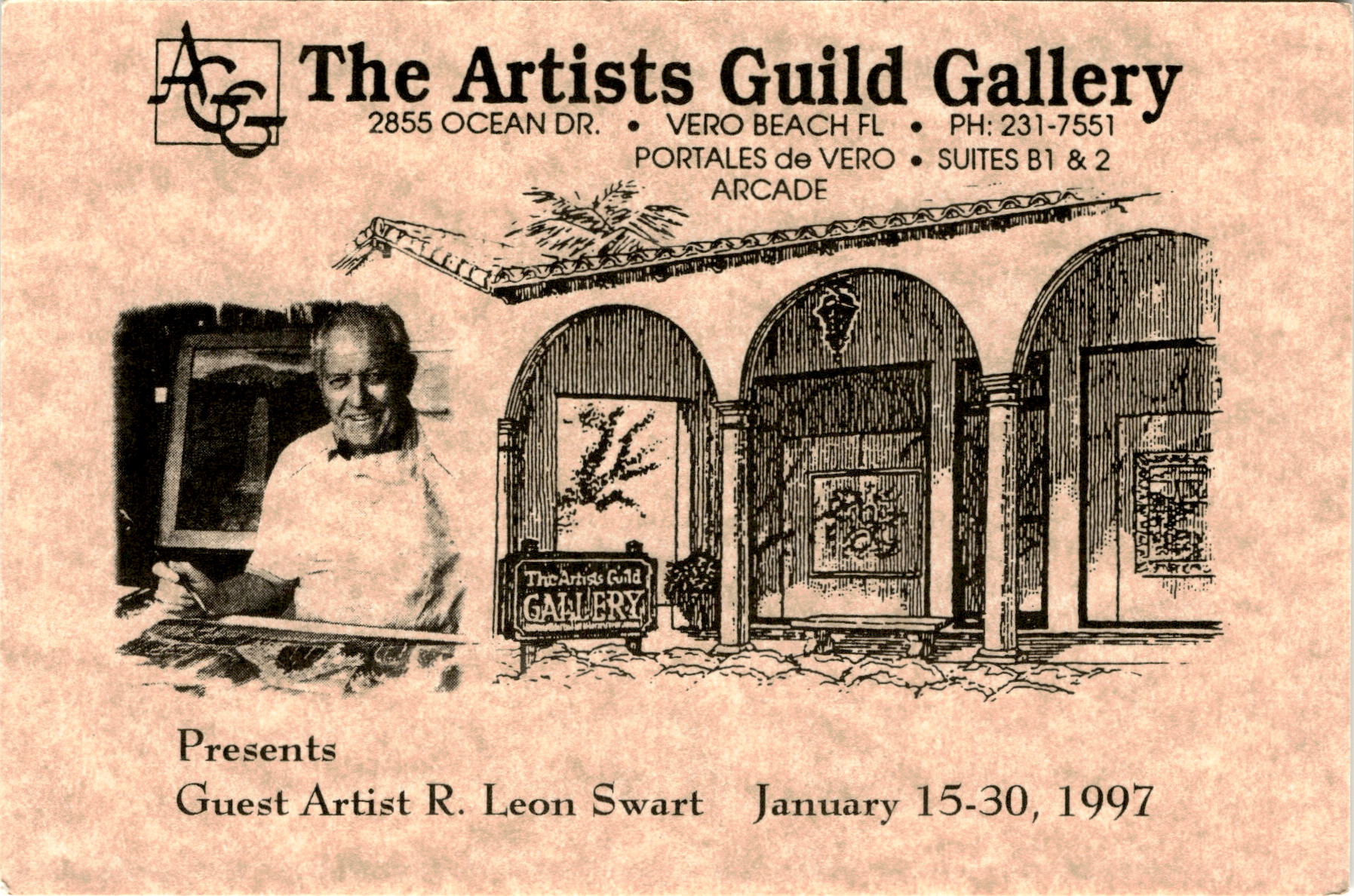 Back of PostcardThe postcard from The Artists Guild Gallery in Vero Beach, Florida, showcases the work of guest artist R. Leon Swart. The gallery is hosting an exhibition of Swart’s super realist watercolors and other art media from January 15-30, 1997. Visitors are invited to meet the Barefoot Bay artist at a reception on Friday, January 17 from 5:00-7:00 p.m.Located on Ocean Dr. in Vero Beach, the Artists Guild Gallery is known for featuring a variety of talented artists and their unique works. Swart’s exhibition promises to be a highlight for art enthusiasts in the area, with his stunning super realist watercolors sure to captivate viewers. The postcard serves as a reminder for art lovers to mark their calendars and attend the reception to meet the artist in person.The postcard not only serves as a promotional tool for the gallery and Swart’s exhibition, but also as a keepsake for those who attend the event. The design of the postcard, with its bold text and inviting imagery, reflects the vibrant and creative atmosphere of the Artists Guild Gallery. Whether you’re a longtime fan of Swart’s work or simply appreciate fine art, this exhibition is a must-see for anyone in the Vero Beach area during January 1997.