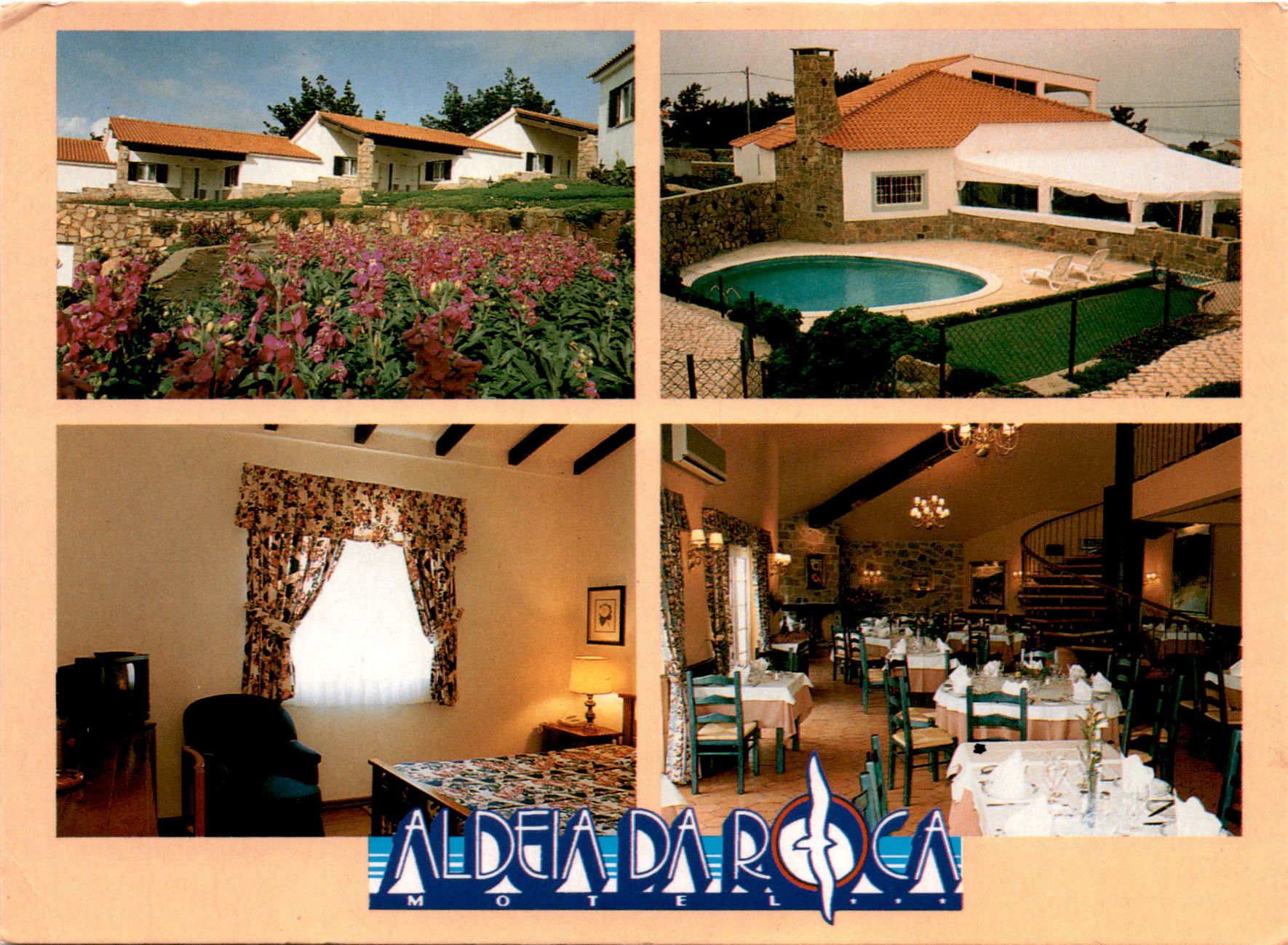 Back of PostcardThe postcard is from Aldeia da Roca, a village located in Azóia, Colares, Sintra, Portugal. The village offers accommodation, a restaurant, meeting spaces, and leisure activities. It mentions having dinner at the westernmost point of Europe on November 14, 1994. Sintra is known for its historic buildings, including the colorful