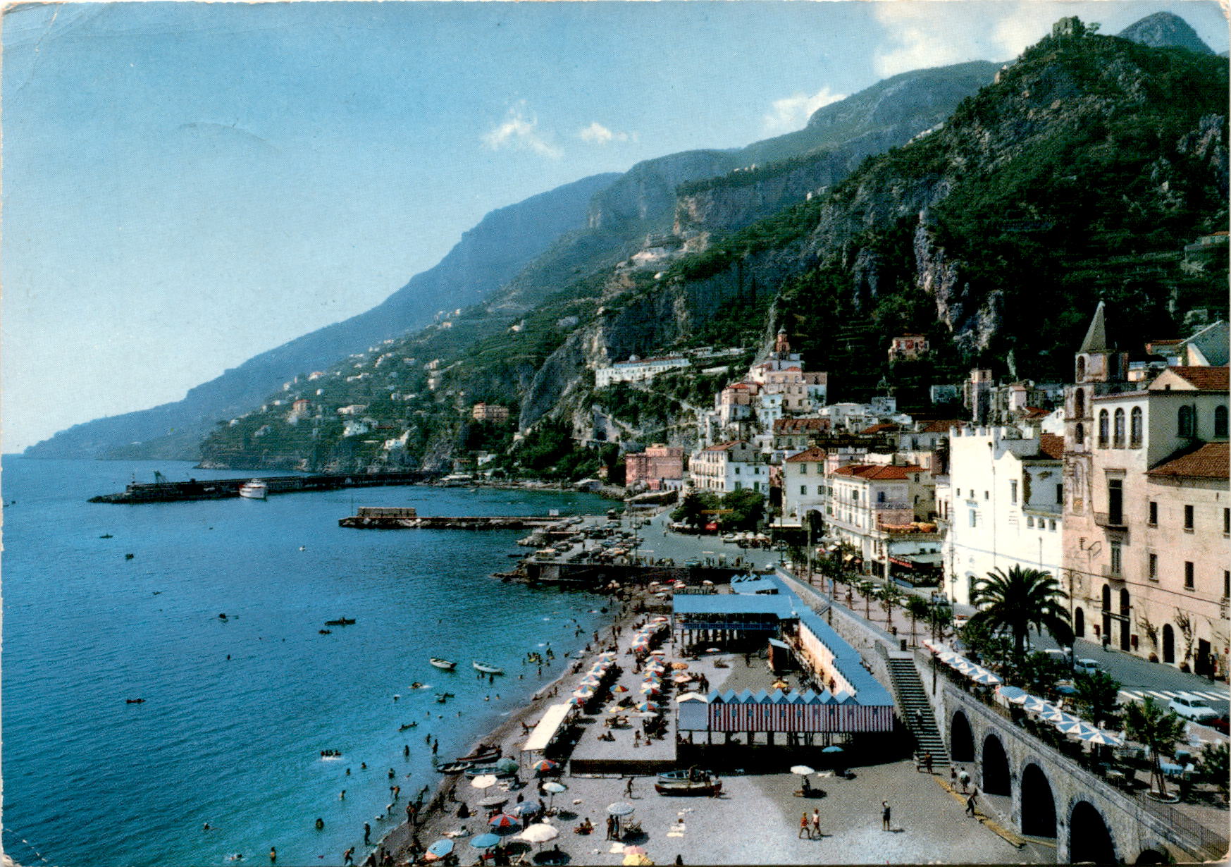 The postcard is from Amalfi, featuring a panorama and beach. The sender mentions a perfect trip to date in Naples, sighting of Capri, and a drive through Cementing. They also refer to meeting Mr. Jack D and Robert, possibly from Mt. Lebanon. The postcard includes a mention of a voice heard in Rome and a visit to Sicily planned