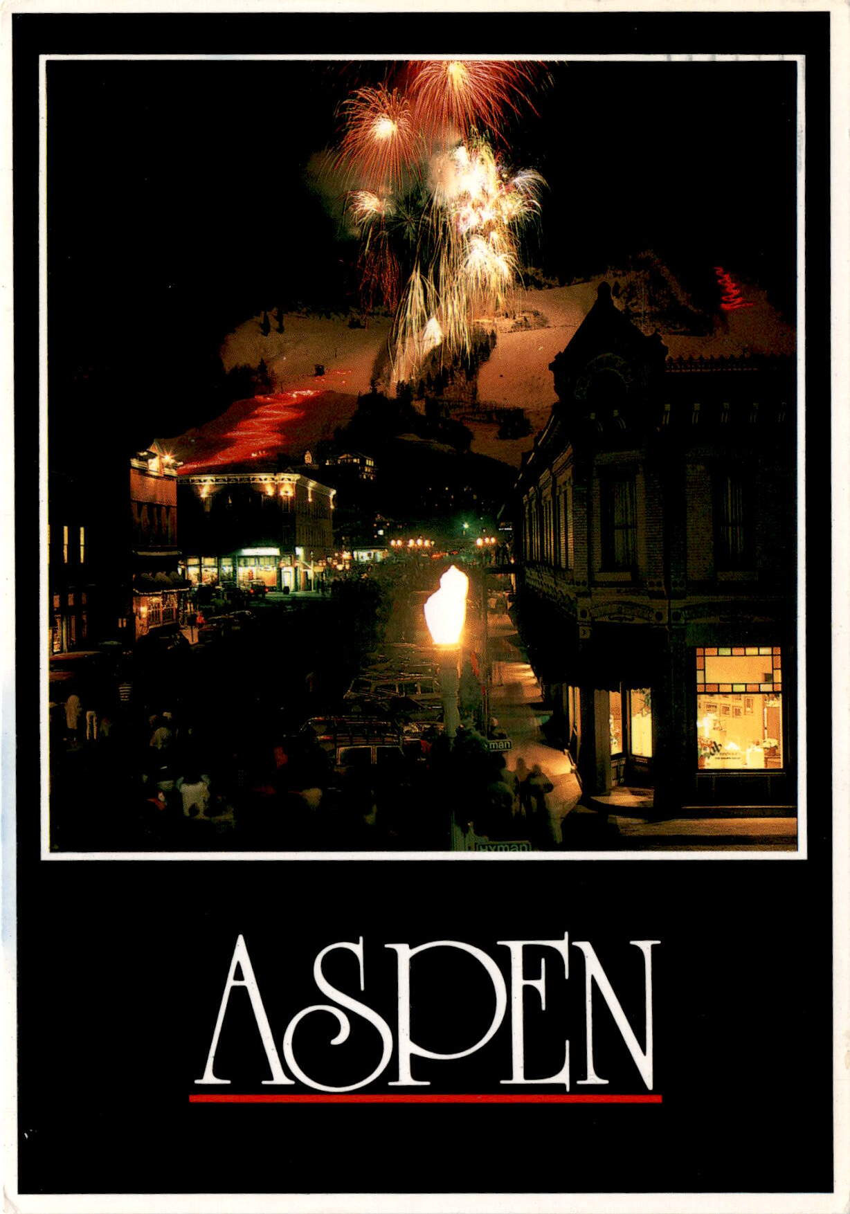 The postcard is from Aspen, Colorado, featuring the WinterSkol celebration with fireworks and a torch descent on skis. WinterSkol is an annual winter festival held in Aspen, known for its vibrant celebrations and events. The postcard mentions the WinterSkol celebration happening during the week, including