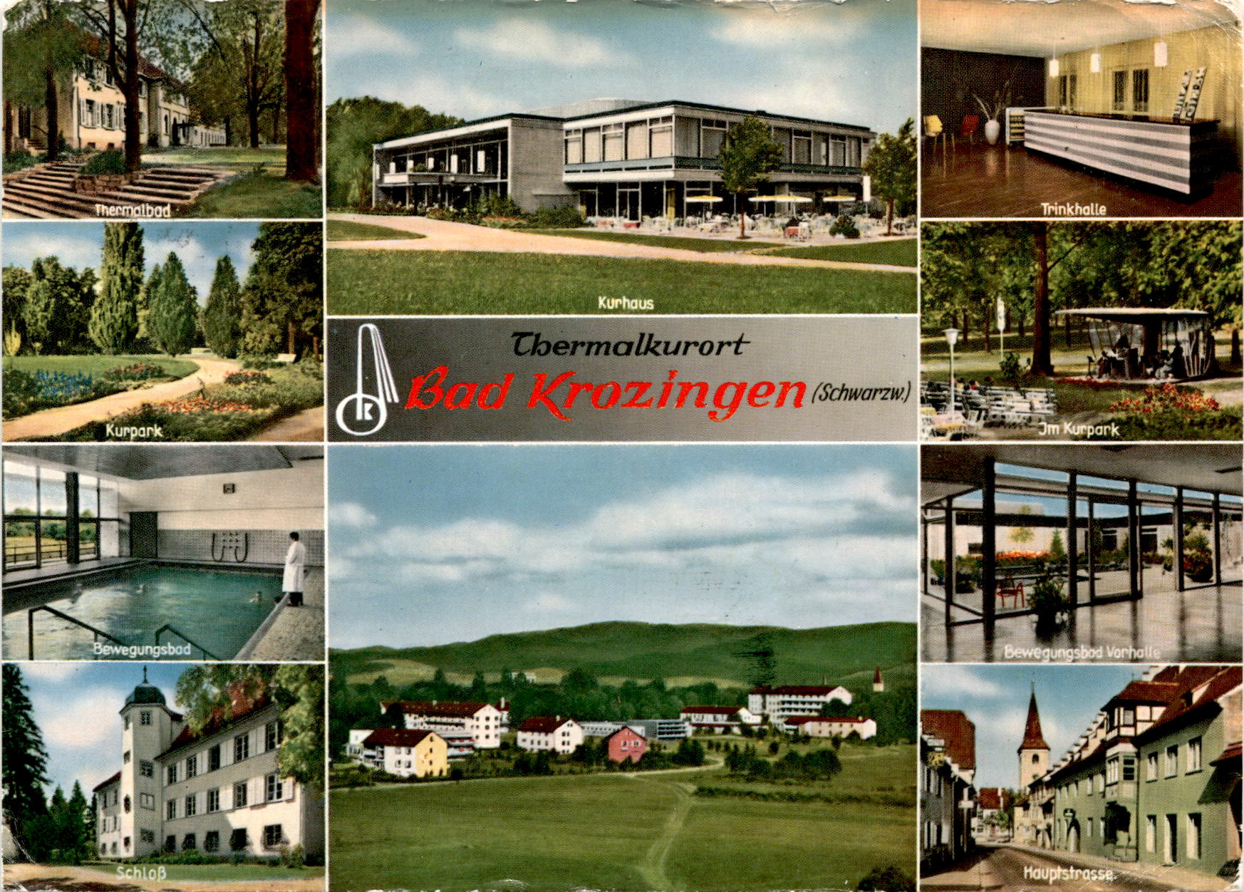 The postcard is from Bad Krozingen, a thermal spa town in Germany known for its healing waters and wellness facilities. The Kurpark and Kurhaus are popular attractions, offering relaxation and therapeutic treatments. The Trinkhalle is a historic drinking