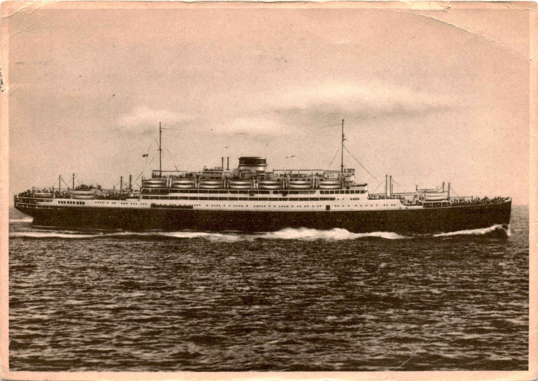 The postcard is from a passenger named Clara Puncer, traveling on the Italian cruise ships Vulcania and Saturnia operated by the Società di Navigazione Genova in 1958. The ships were known for their luxury and style, offering comfortable voyages across the Atlantic. Clara mentions having a pleasant trip at a reasonable cost