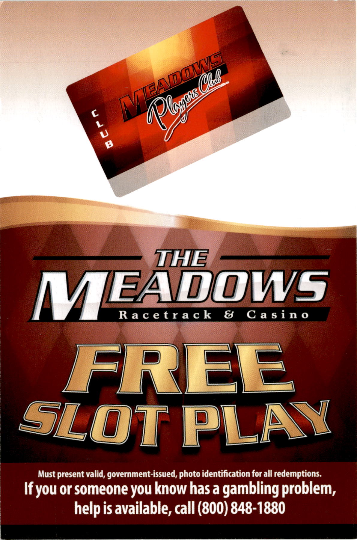 The postcard is an advertisement for Club Meadows at The Meadows Racetrack & Casino, offering $5 in FreePlay valid on May 4th, 5th, or 6th. Recipients must be 21 years or older and a member of the Meadows Players Club to redeem the
