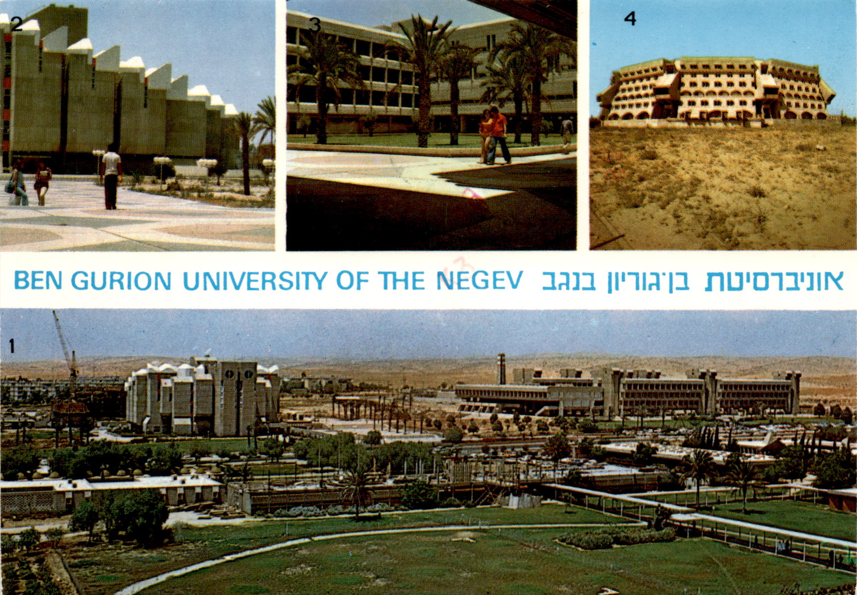 The postcard is from a visit to Israel, specifically mentioning Ben Gurion University of the Negev in Beersheba. The sender mentions enjoying their time immensely with friends and relatives, exploring places like Tel Aviv and mentioning the great weather. The postcard also includes a view of the university’s new campus, showcasing the Aranne Central Library, main quadrangle, and new dormitories.Ben Gurion University of the Negev is a prominent research university in Israel, named after the
