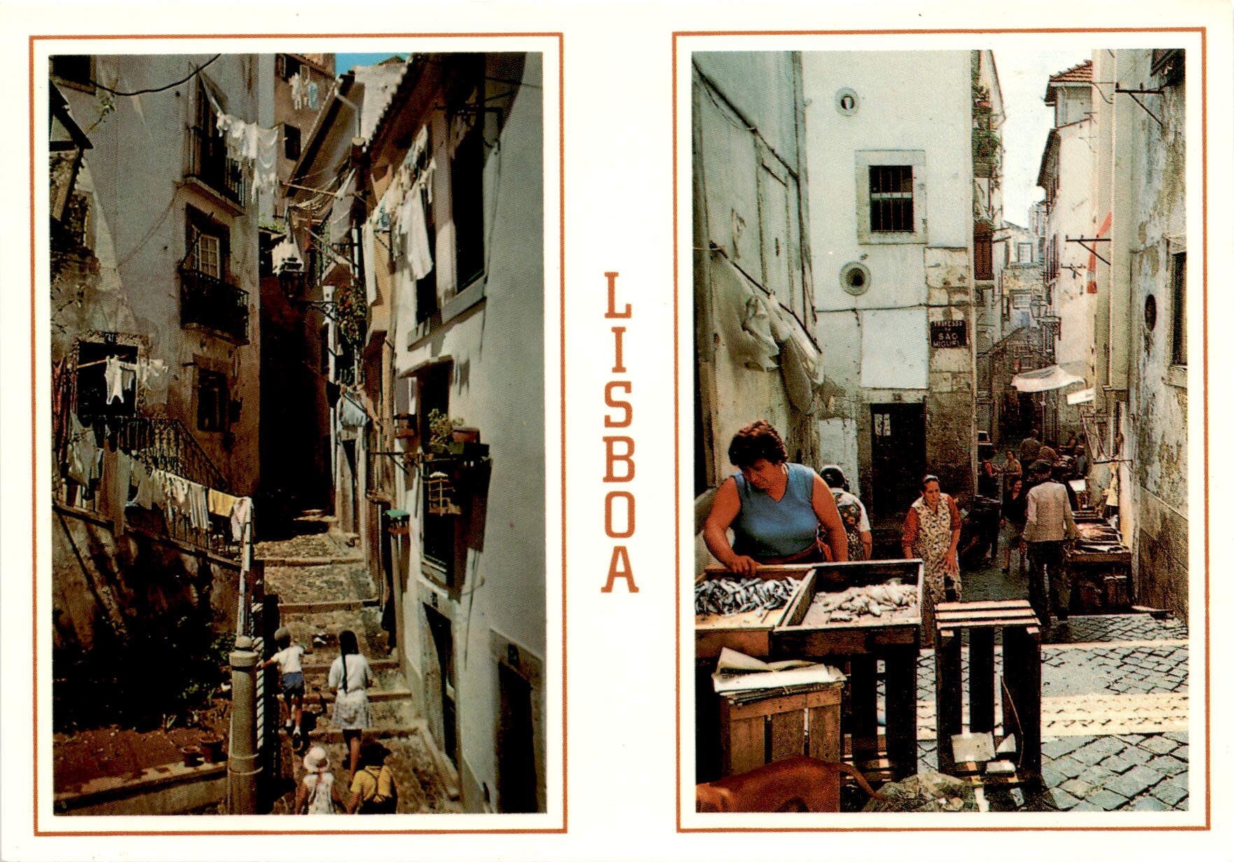 The postcard is a souvenir from Lisbon, Portugal, featuring a view of the city. The front of the postcard includes the text Recordação de Lisboa (Souvenir of Lisbon) in Portuguese and French. The back of the postcard mentions that it is part of the DÚ