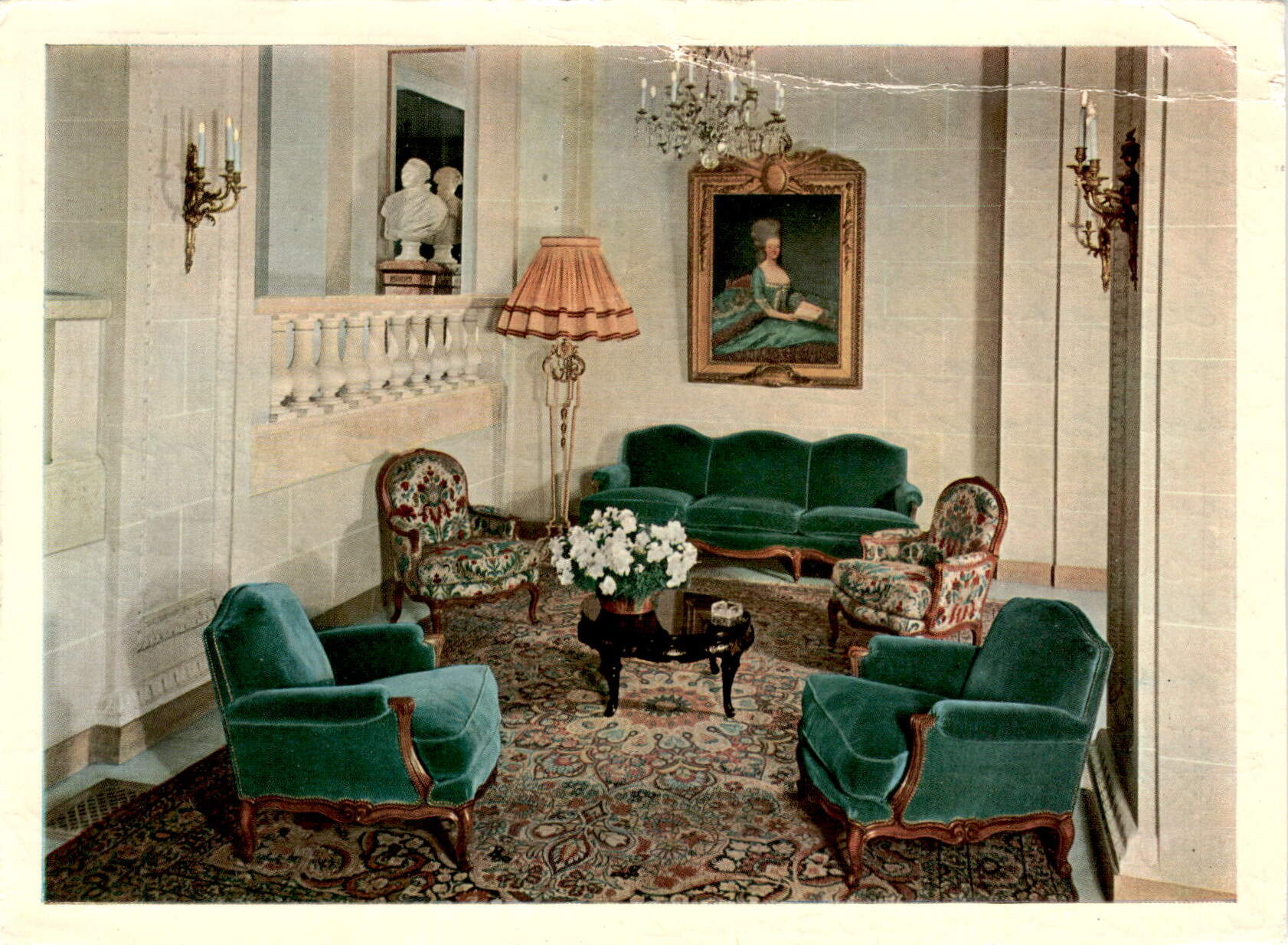 The postcard is dated 7-7-70 and mentions a trip to Paris, specifically staying at the Hotel LE BRISTOL. The sender drove a car to Paris in 1970 and visited a garage on the outskirts of the city. The postcard features a stamp from FALAIS DU CNIT REPUBLIQUE FRANCAISE and mentions a trip from 26 Sept to 3 Oct 1970 in Dordogne. It also references Miss Pat Kep