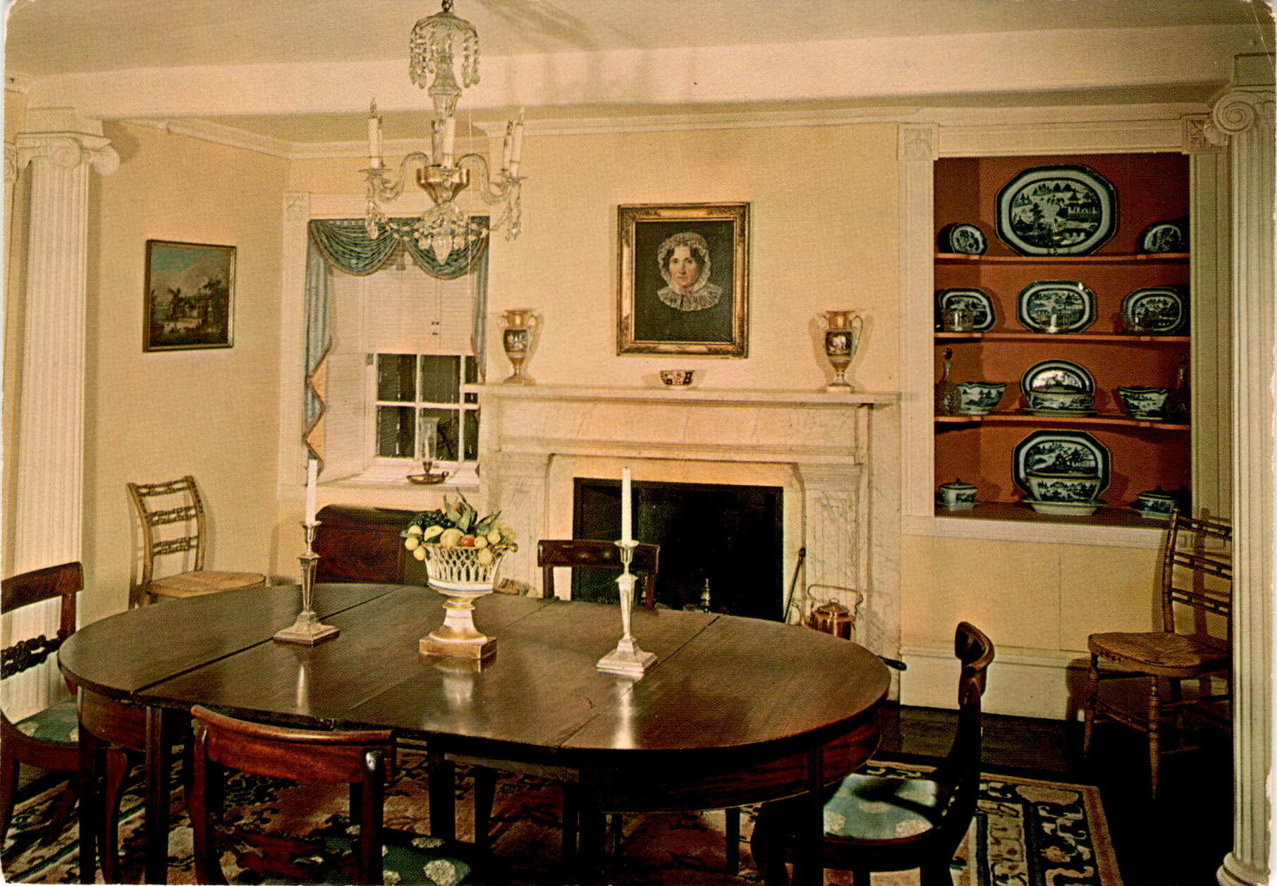 Back of PostcardThe postcard features the Abigail Adams Smith Mansion, built in 1799, showcasing the dining room with a portrait of Mrs. John Adams, mother of Abigail Adams Smith. The mansion is preserved by The Colonial Dames of America. The dining room also features fine Canton china in a cupboard and a crystal chandelier from the period. The mansion is located at 421 East 61st Street in New York City. The color reproduction is by L. H. Frohman, and the photography is by Gottscho-Schleisner, Inc.